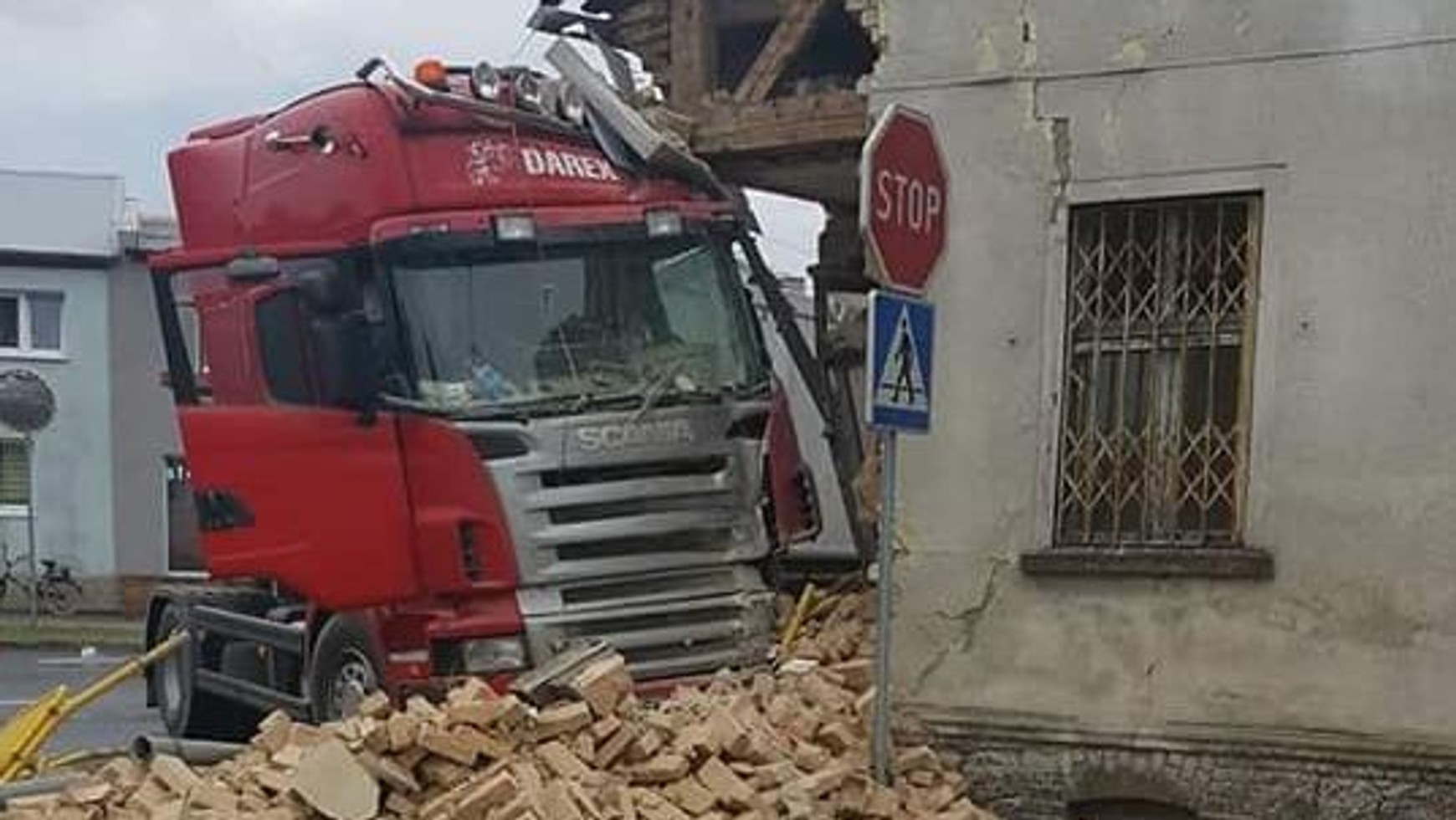 Tylko chyba cudem dom się nie zawalił, chociaż dwie narożne ściany zostały niemalże całkowicie zdemolowane przez dużą ciężarówkę. Zdarzenie miało miejsce na ul. Głównej w miejscowości Przytoczna koło Skwierzyny. Sprawcą był kierowca osobowego Volkswagena, który nieoczekiwanie zjechał na lewy pas ruchu, którym z przeciwnej strony nadjeżdżała ciężarówka. Próba uniknięcia czołowego zderzania i zapewne tragedii zakończyła się wjechaniem TIR-a w jednopiętrowy dom. Chyba tylko cudem budynek się nie zawalił, chociaż z dwóch znacznie uszkodzonych ścian na jezdnie posypały się setki cegieł.