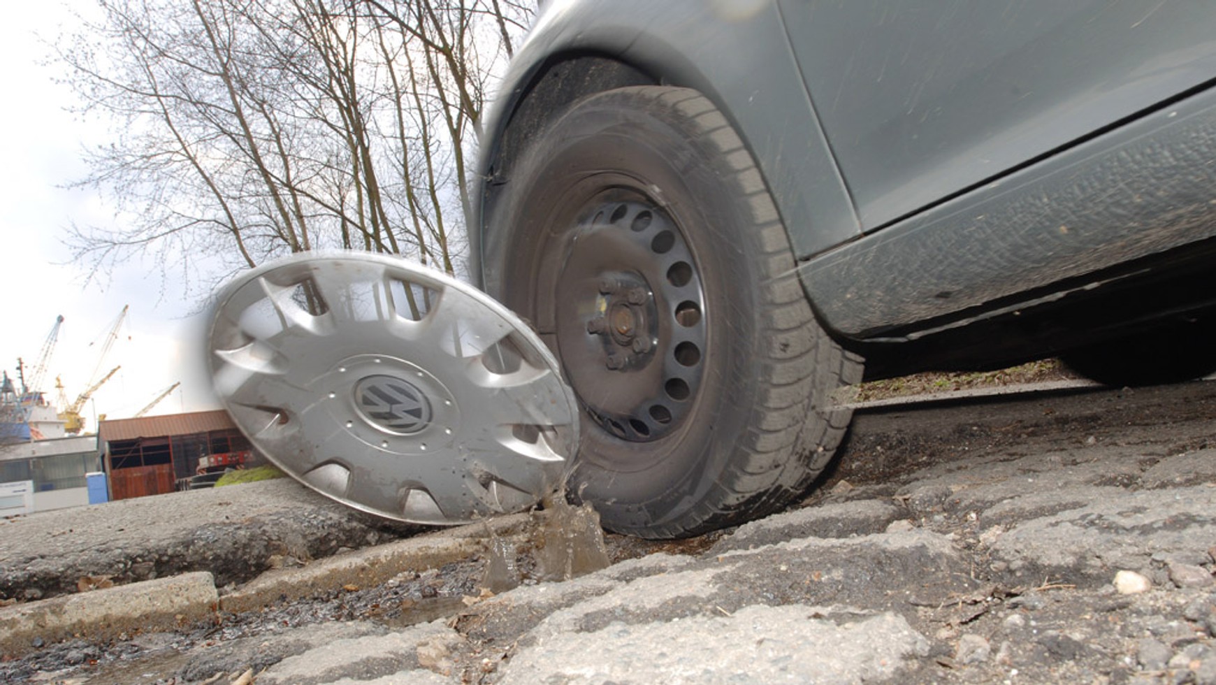 Krawężnik ma oddzielać drogę od chodnika, ale nie może być murem! Z kolei pobocze nie powinno przypominać rowu przeciwczołgowego. Na małym zdjęciu poniżej zapewne tego nie widać, ale sfotografowana krawędź drogi jest usłana resztkami połamanych kołpaków, spoilerów i zderzaków. Najechanie na krawężnik może mieć też poważniejsze konsekwencje, grozi m.in.: rozerwaniem opony, połamaniem felg, uszkodzeniem elementów zawieszenia i układu kierowniczego, przebiciem miski olejowej. Zapadnięte krawędzie dróg są szczególnie niebezpieczne po deszczu, kiedy wyrwy maskuje zalegająca w nich woda.