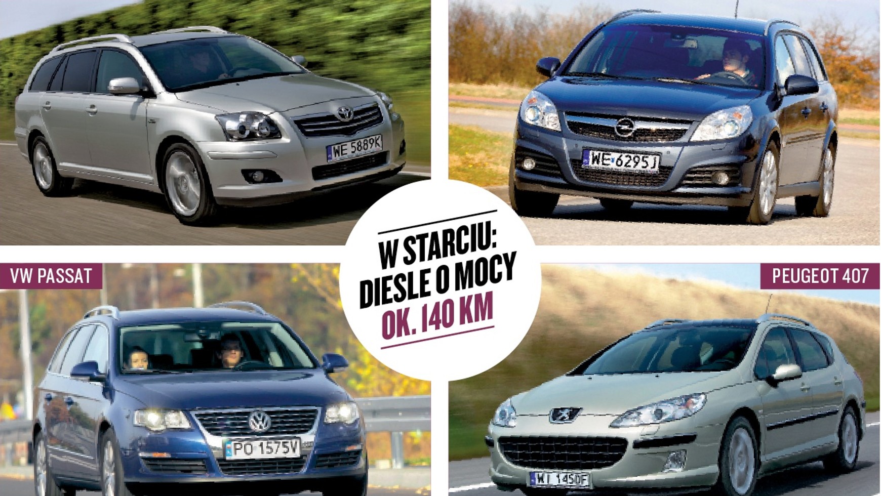 Kilkuletnie kombi klasy średniej z oszczędnym dieslem to marzenie wielu ojców rodzin. Tym bardziej gdy jest tanie podczas eksploatacji, rzadko się psuje i kosztuje 20-25 tys. zł. Który z naszych bohaterów najlepiej wywiązuje się z powyższych założeń i będzie najlepszym wyborem? Do walki stają 10-letnie: Opel Vectra, Peugeot 407, Toyota Avensis oraz Volkswagen Passat, z popularnymi dieslami o mocy ok. 140 KM.