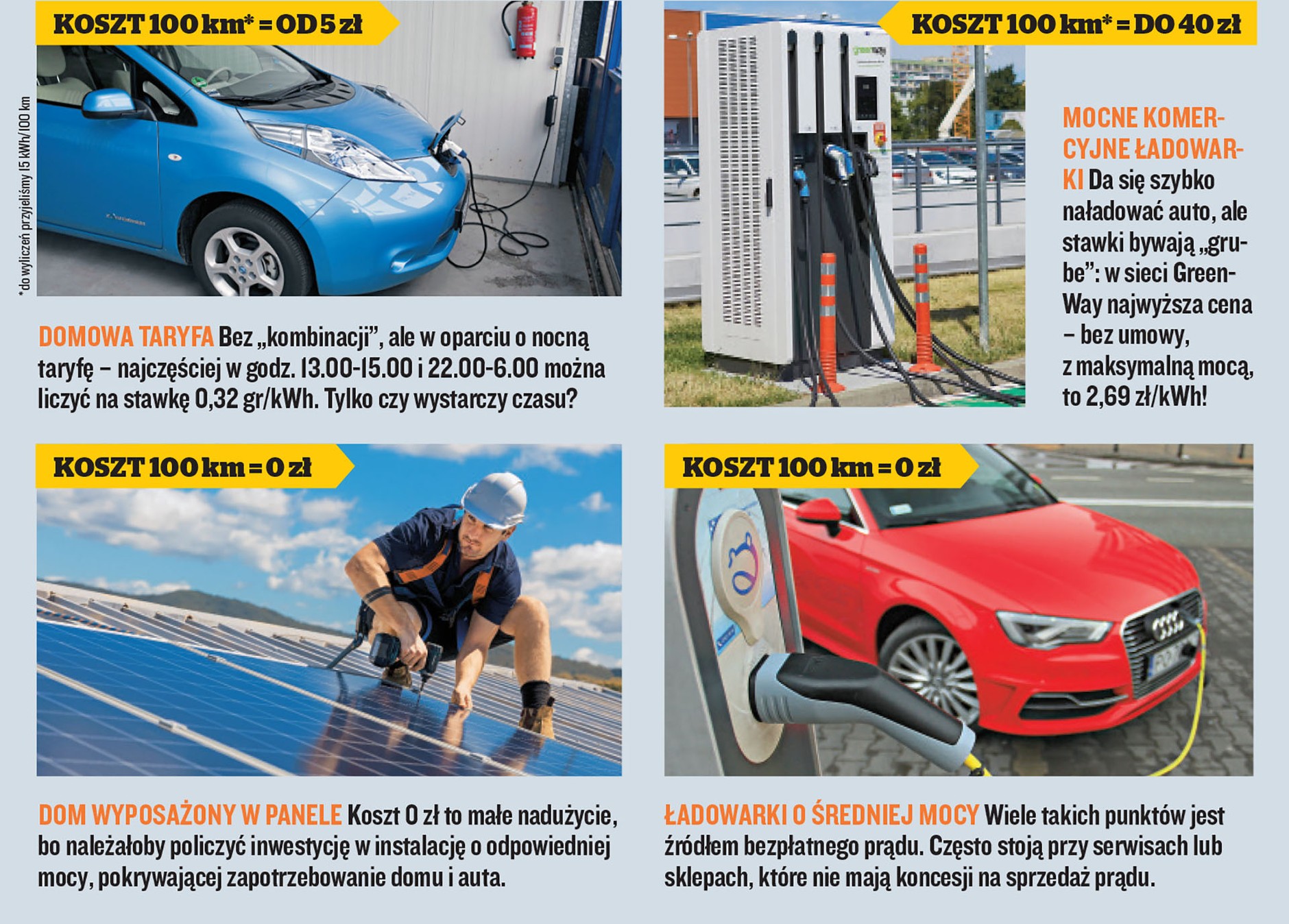 Jazda autem elektrycznym wiąże się z koniecznością ładowania baterii. Czy jest to łatwe zadanie? Wiele zależy od sytuacji. Jeśli mieszkacie w bloku i w pobliżu nie ma średniej lub szybkiej ładowarki, lepiej chyba odłożyć taki zakup. Na osiedlach strzeżonych czy w biurowcach warto spytać w administracji o możliwość stworzenia gniazda do ładowania, ale trzeba mieć świadomość tego, że będzie w nim zapewne niska moc i na naładowanie elektryka może zabraknąć całej nocy (koniecznie ustalcie szczegóły: moc przyłącza i sposób rozliczania energii).