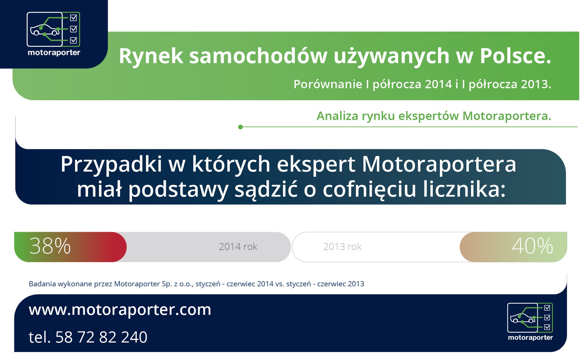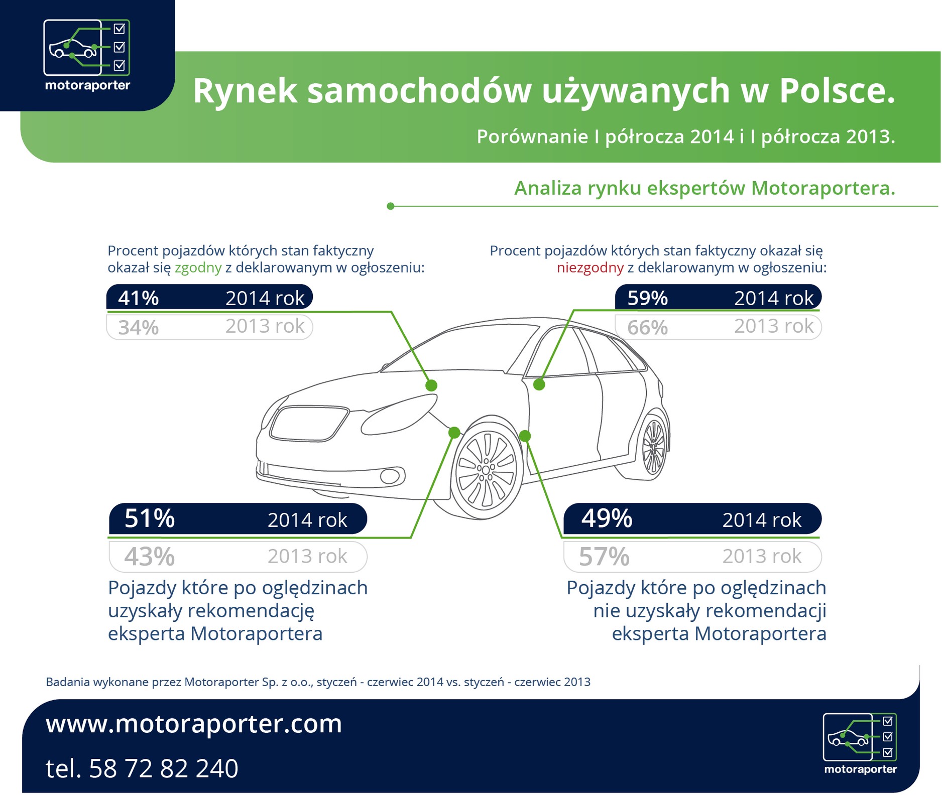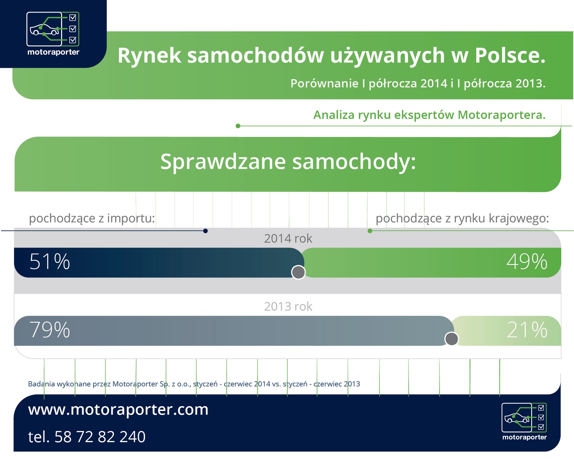 I półrocze 2014 roku to po raz pierwszy w historii publikowanych raportów Motoraportera ilość sprawdzanych samochodów pochodzących z rynku krajowego i z importu są bardzo zbliżone – 49 vs 51%.