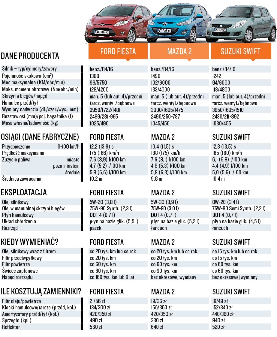 Ford Fiesta kontra Suzuki Swift i Mazda 2 - dane techniczne i koszty eksploatacji