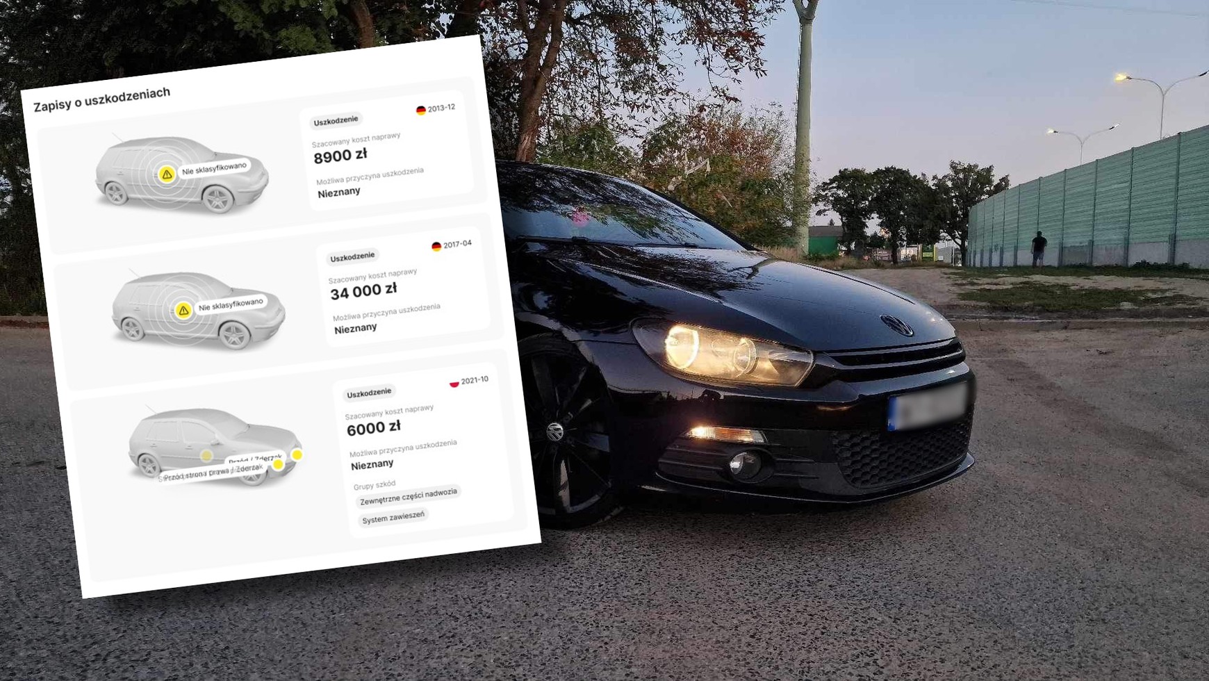 Gorzej z drugim zapisem — uszkodzenie szacunkowo na aż 34 tys. zł, po 5 latach od produkcji auta. Niestety również bez szczegółów, ale tu już mógł się wydarzyć poważny "dzwon". Ponadto była także informacja, że potem auto zostało wystawione na sprzedaż w Niemczech, a później... trafiło do Polski. Typowy scenariusz.