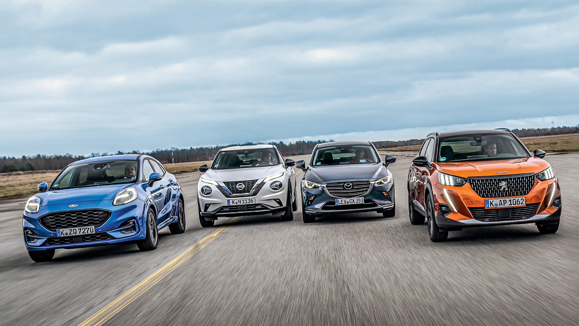 Pod względem osiągów najlepiej wypada Mazda – mimo stosunkowo niskiej mocy (120, potem 121 KM) CX-3 osiąga pierwsze 100 km/h już po 9,6 s (dane testowe). Raczej ospały okazuje się najsłabszy w teście Nissan (117 KM) – 11,2 s do setki. Znacznie gorzej wolnossąca Mazda wypada za to w próbach elastyczności, choć i tak jest niewiele gorsza od Nissana. Ford i Peugeot natomiast grają w tym wypadku we własnej lidze – 2008 potrzebuje na rozpędzenie się od 80 do 120 km/h na najwyższym biegu o ponad 8 s mniej (!) niż CX-3.