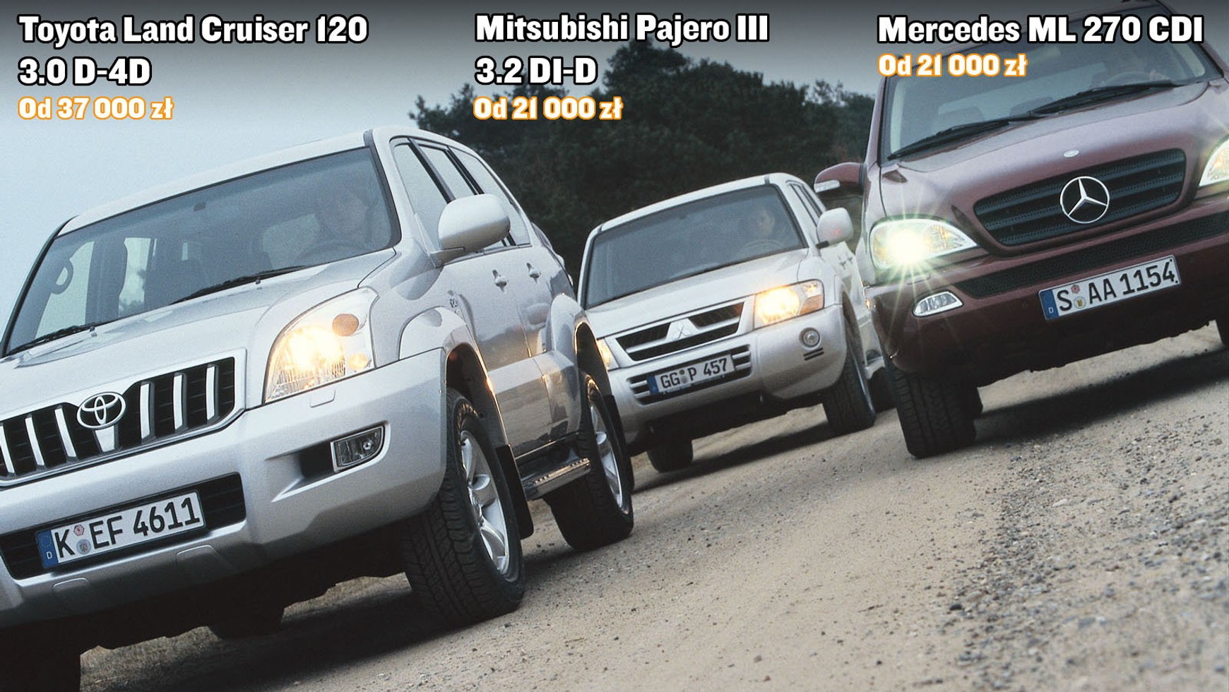 W porównaniu aut z 2003 roku znalazły się niemal kultowe japońskie modele Pajero i Land Cruiser 120 oraz pierwszy niemiecki SUV premium: ML. Trzecia generacja terenówki Mitsubishi debiutowała w 1999 r., w 2002 r. przeszła delikatny lifting. Toyota Land Cruiser 120 w 2002 r. zastąpiła model 90. Mercedes ML wjechał do salonów w 1997 r., w 2001 r. przeprowadzono delikatny retusz.