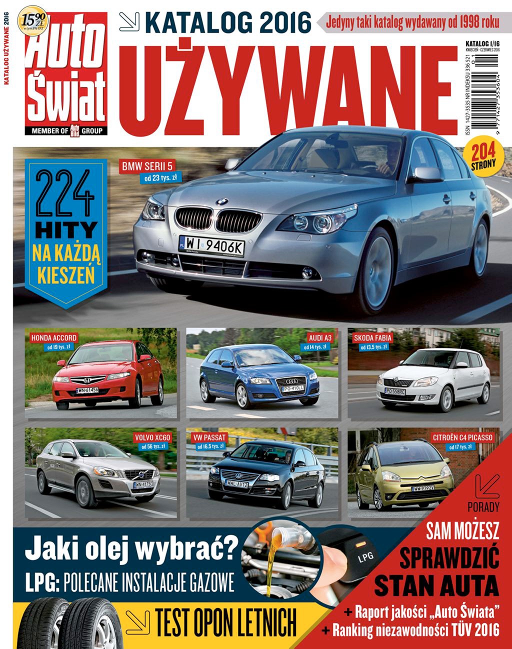 To już 19. wydanie katalogu „Samochody Używane 2016”, naszej autorskiej publikacji, w której rzetelnie oceniamy ponad 200 najpopularniejszych aut różnych segmentów i marek. Wymieniamy wady i zalety, podajemy szczegółowe dane techniczne, polecamy silniki, opisujemy typowe awarie, radzimy, na co zwrócić uwagę przy zakupie auta. Nie zabrakło praktycznych porad ani raportów jakości. Wszystko po to, żeby profesjonalnie i rzeczowo podejść do zakupu wymarzonych czterech kółek, wybrać dobry samochód i z odpowiednim silnikiem, który da dużo zadowolenia podczas jazdy, będzie tani w eksploatacji, trwały i niezawodny.