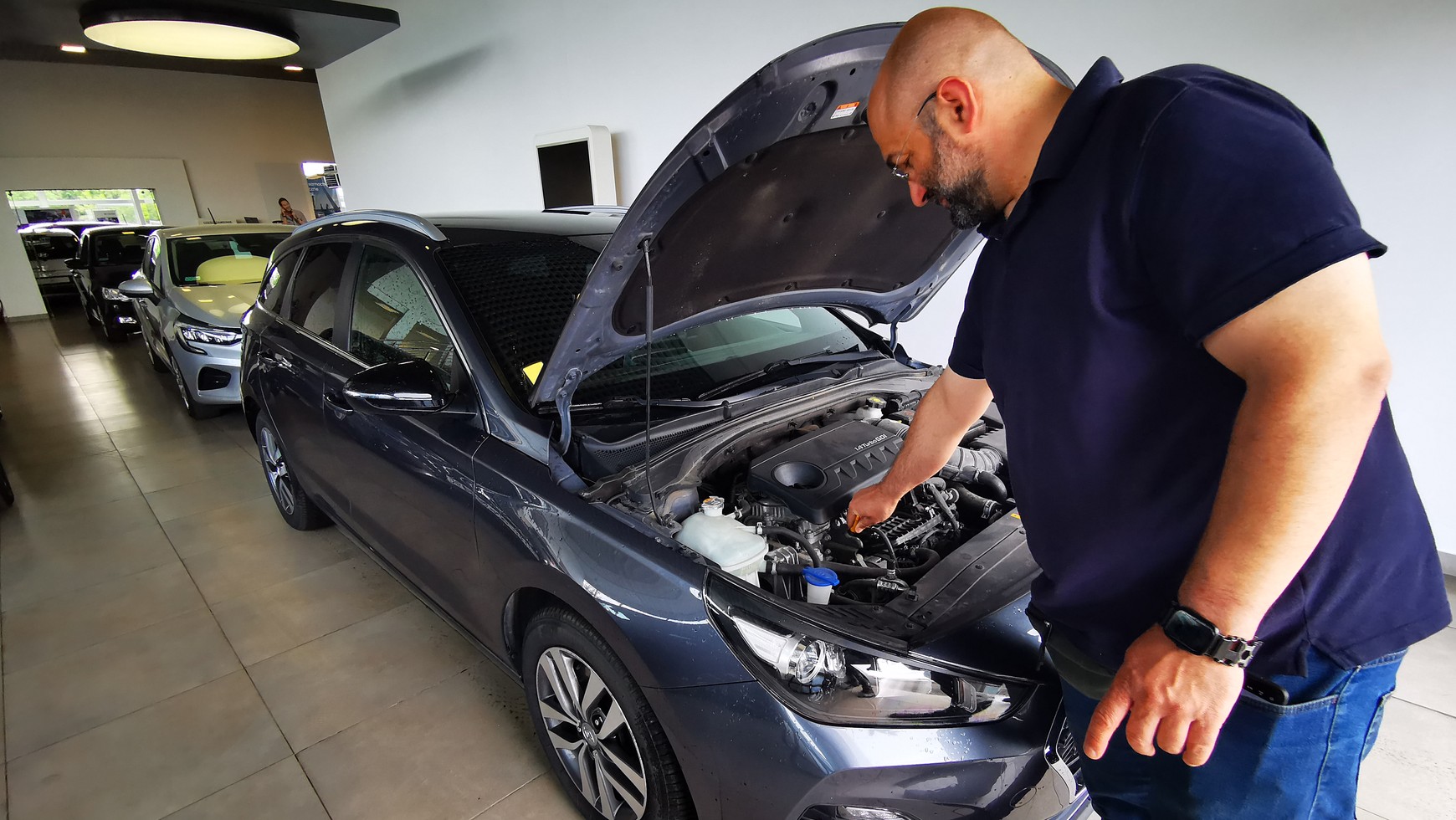 A tymczasem za oknem rozpadało się na dobre i młody sprzedawca, pan Michał, decyduje, że wprowadzi auto do salonu, byśmy nie musieli oglądać go na deszczu. Małe przemeblowanie: jedno auto w prawo, drugie w lewo i po chwili i30 wjeżdża do hali.