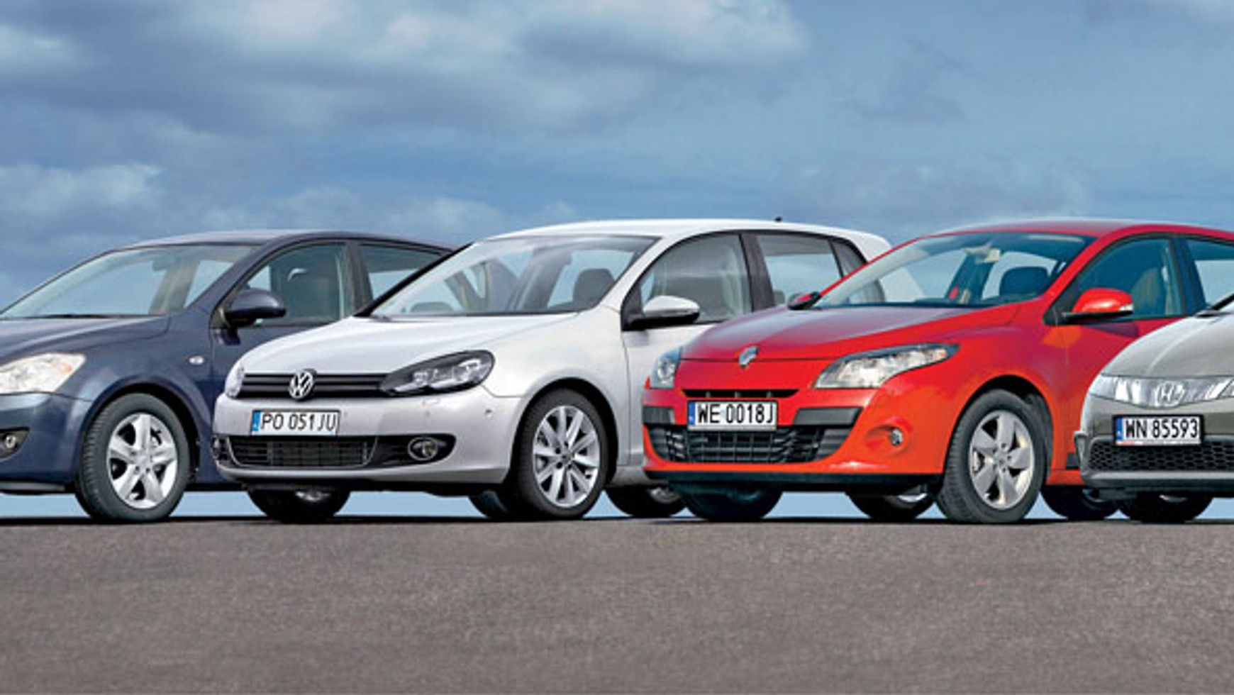 Właśnie kompakty o takiej mocy stają do walki w naszym porównaniu. Liczące 5 lub 6 lat Honda Civic, Kia cee’d, Renault Mégane i VW Golf w wersji hatchback (5d) mają udowodnić swoją wyższość pod względem nie tylko przyjemności z jazdy i przydatności na co dzień, lecz także trwałości, niezawodności, kosztów serwisu oraz eksploatacji.