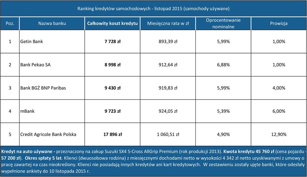 O przesłanie ofert finansowania nowego i używanego Suzuki poprosiliśmy banki komercyjne udzielające kredytów samochodowych. Odpowiedzi otrzymaliśmy z pięciu banków i to ich oferty porównujemy w rankingu.