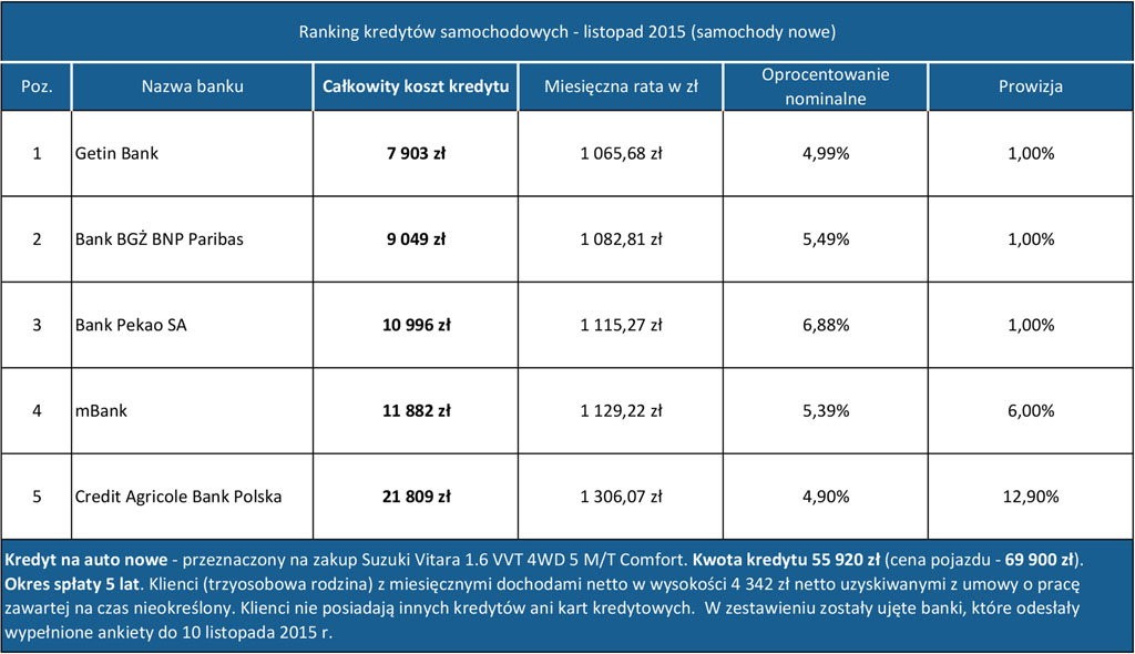 Zdecydowanym zwycięzcą listopadowego rankingu kredytów samochodowych okazał się Getin Bank. Bank ten zaproponował najkorzystniejszą ofertę zarówno dla klientów chcących sfinansować zakup nowego, jak i używanego samochodu.