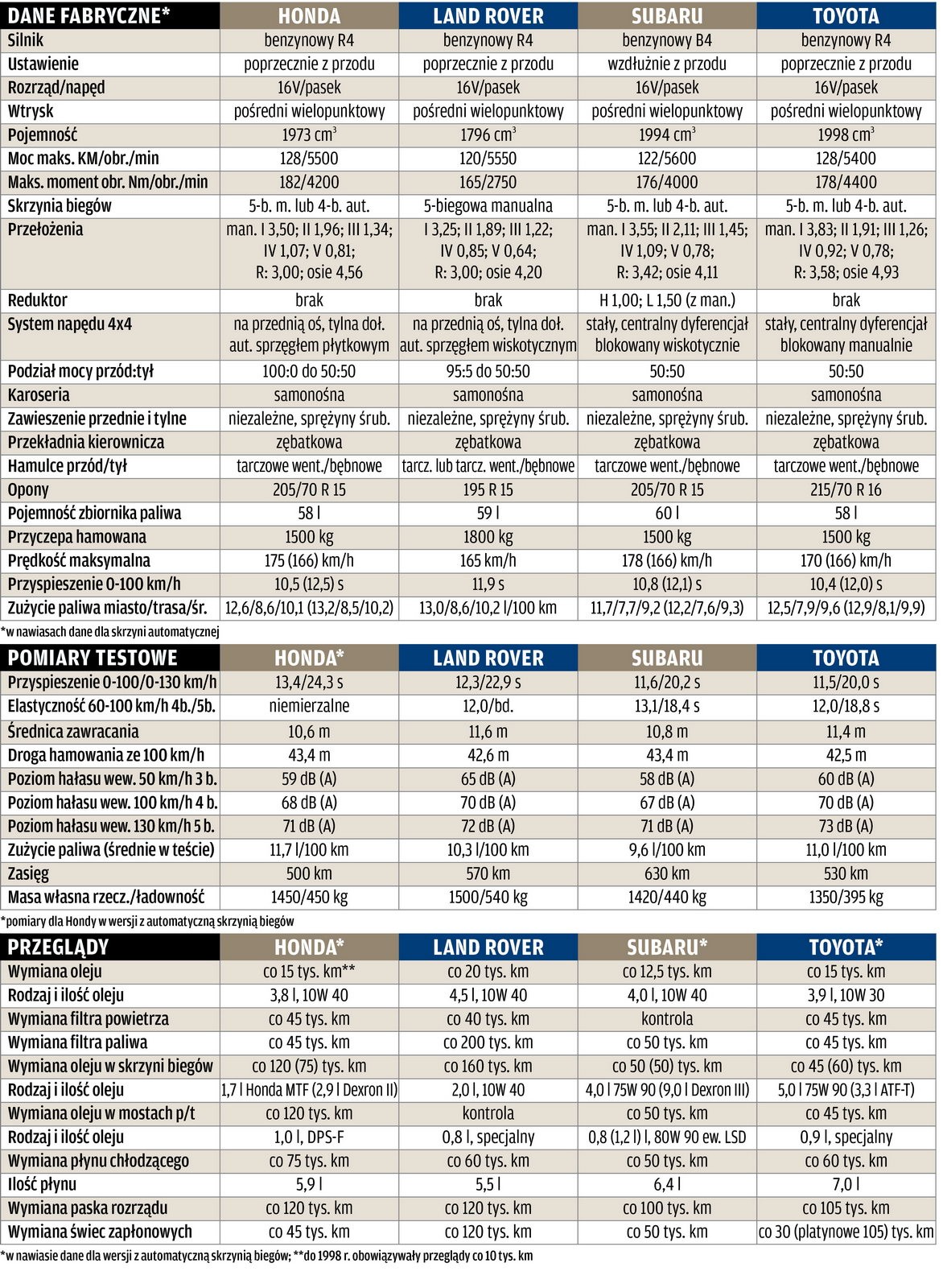 Przed wytypowaniem zwycięzcy porównania warto poznać ceny i potencjalne usterki. Najłatwiej kupić Freelandera. W ogłoszeniach czeka kilkaset propozycji. Do zakupu zachęcają też niskie ceny wywoławcze – zarejestrowany, 5-drzwiowy samochód benzynowy można kupić już za 7000 zł! Trzeba jednak pamiętać, że wiele aut ma kierownicę z prawej strony, zostały bowiem przywiezione z Wlk. Brytanii, wiele też zostało przerobionych z wersji angielskich. Takie egzemplarze mają znacznie niższą wartość na rynku. Pozytywnie zaskakują też ceny wywoławcze Toyot i Foresterów (odpowiednio: od 8500 zł i 8000 zł), nieco więcej trzeba przygotować na zakup Hondy i w przypadku tej marki na rynku jest najmniej ofert.