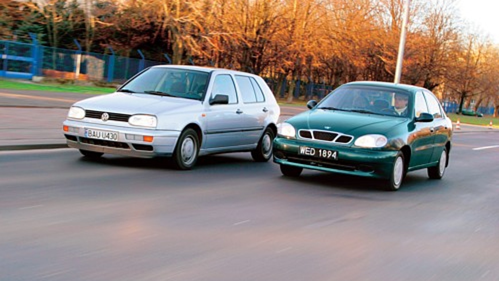 Zawieszenie Golfa jest twardsze. Karoseria mniej się pochyla na zakrętach, choć podobnie jak konkurent w ekstremalnych sytuacjach podczas pokonywania wiraży wykazuje niewielką nadsterowność. Skuteczność hamulców wyraźnie lepsza - 43,1 m ze 100 km/h.Pod względem eksploatacyjnym obydwa auta są porównywalne. Trwałość pojazdów marki Daewoo początkowo wzbudzała obawy. Jednak z upływem czasu zyskały całkiem dobrą opinię. Z reguły problemy dotyczą drobnych, choć irytujących uszkodzeń. Dokuczliwe są usterki osprzętu elektrycznego (niekiedy szwankuje wentylator nawiewu, posłuszeństwa odmawia instalacja radiowa) i konieczność dość częstego poprawiania ustawienia fotela kierowcy.