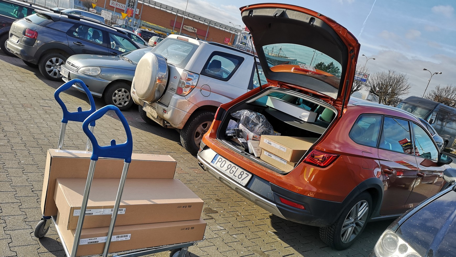 Na miejscu czekał na nas spory wózek wypełniony dość ciężkimi paczkami oraz licznymi drobiazgami. Najdłuższe z paczek miały ponad 1,5 m długości. By je zmieścić trzeba było zatem pochylić oparcie kanapy. To zaś jest dość wygodne w Seacie Leonie X-Perience. Nie trzeba bowiem otwierać tylnych drzwi albo wyciągać ręki przez bagażnik by zwolnić blokadę. Wystarczy bowiem sięgnąć po praktyczne dźwignie po obu stronach bagażnika.