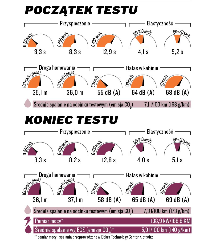 - Podczas pomiarów na koniec testu osiągi minimalnie wzrosły, natomiast nieco pogorszyła się skuteczność hamulców.