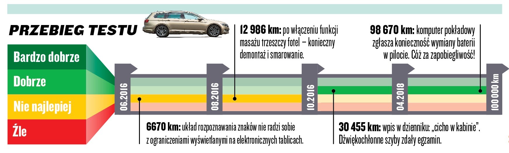 Początek testu długodystansowego powinien wyglądać właśnie tak: gdy tylko Passat pojawił się na naszym parkingu – był to koniec maja 2016 r. – od razu... zniknął. W 10 dni niemieckie kombi pokonało 5300 km, a testujący, który dokonał tego wyczynu, napisał w dzienniku wozu: „Idealne auto na długie trasy – duże, komfortowe, szybkie i oszczędne”. Do tego naszego Passata wyposażono w fotele z masażem, który akurat nie działał za dobrze – po jego uruchomieniu fotel zaczynał trzeszczeć i jęczeć jak stary tapczan. Już po przebiegu 12 986 km w dzienniku zapisano, że „to najgorszy masaż ever”. Jak się jednak szybko okazało, problem dobrze znają serwisy VW, a jego przyczyną jest niewłaściwy montaż poszczególnych elementów mechanizmu. Pomaga posmarowanie odpowiednim preparatem.