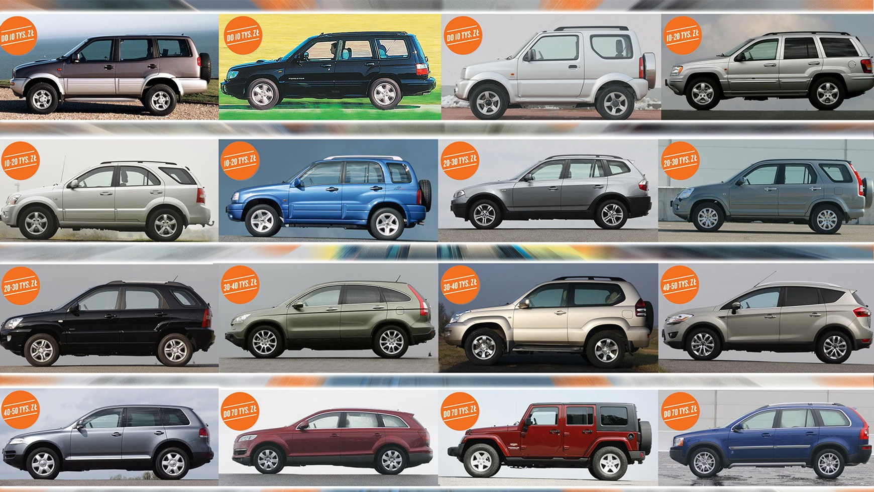 Klasa SUV (nazywana też „terenówki”) stawia przed nabywcami niemałe wymagania. Jedna sprawa to ceny zakupu – są wyraźnie wyższe niż w przypadku aut osobowych, dlatego najniższy prezentowany przez nas przedział cenowy kończy się nie na 5 tys. zł (jak w poprzednich odcinkach), ale na 10 tys. zł.