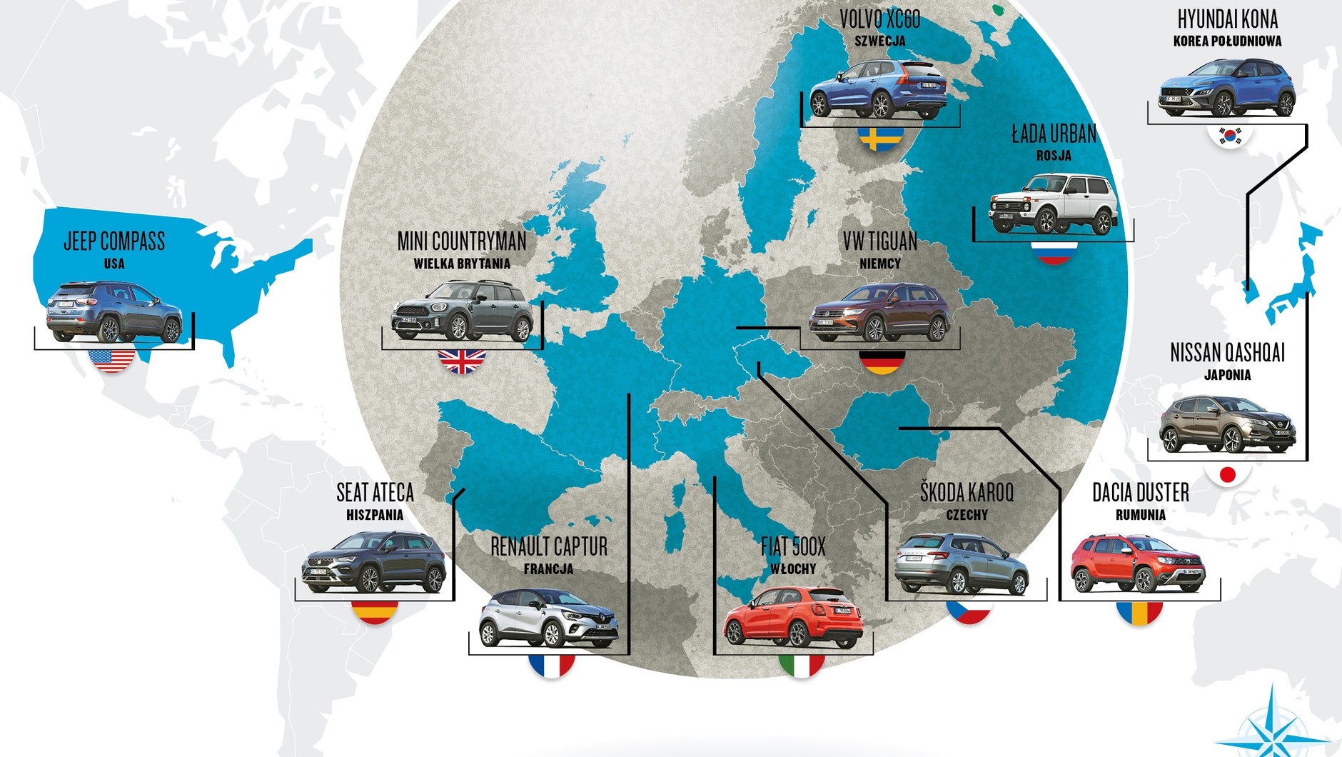 Czy to rustykalny „rosjanin”, sprytne „koreańczyki”, czy żywiołowe „hiszpany” – rynek SUV-ów ma do zaoferowania o wiele więcej, niż czasami nam się wydaje. Tu pokazujemy tylko 12 modeli, ale wybór w każdym właściwie segmencie jest ogromny. Dzięki temu łatwo można dopasować dane auto do własnych preferencji. Jeśli rozważacie zakup SUV-a, najpierw jasno określcie własne wymagania, a na pewno znajdziecie odpowiednie auto – niezależnie od tego, skąd ono ostatecznie pochodzi.