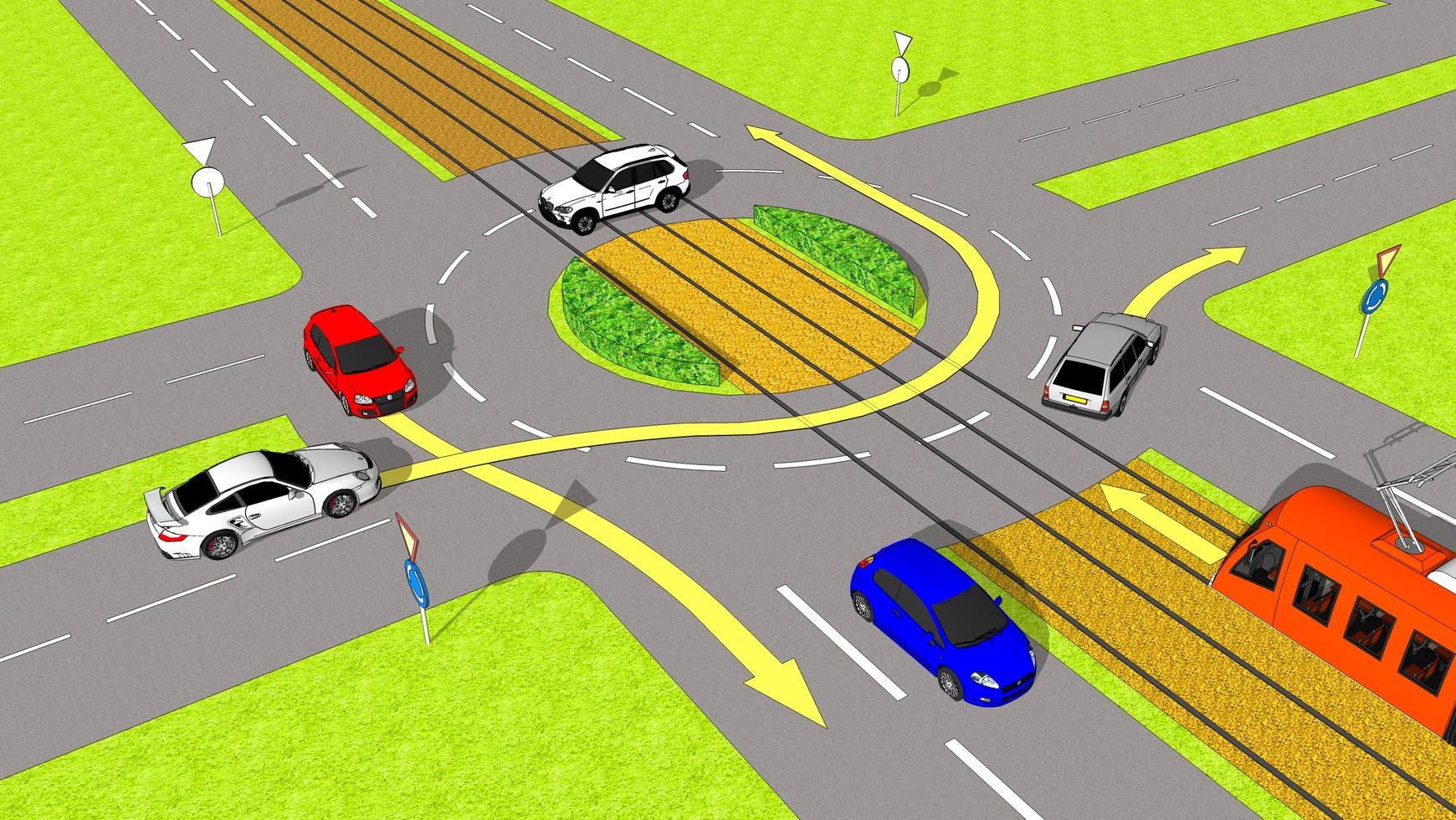 Na rondzie, którego wjazdy oznakowane są tak jak na zdjęciu, pierwszeństwo przed samochodami znajdującymi się na rondzie ma tramwaj: