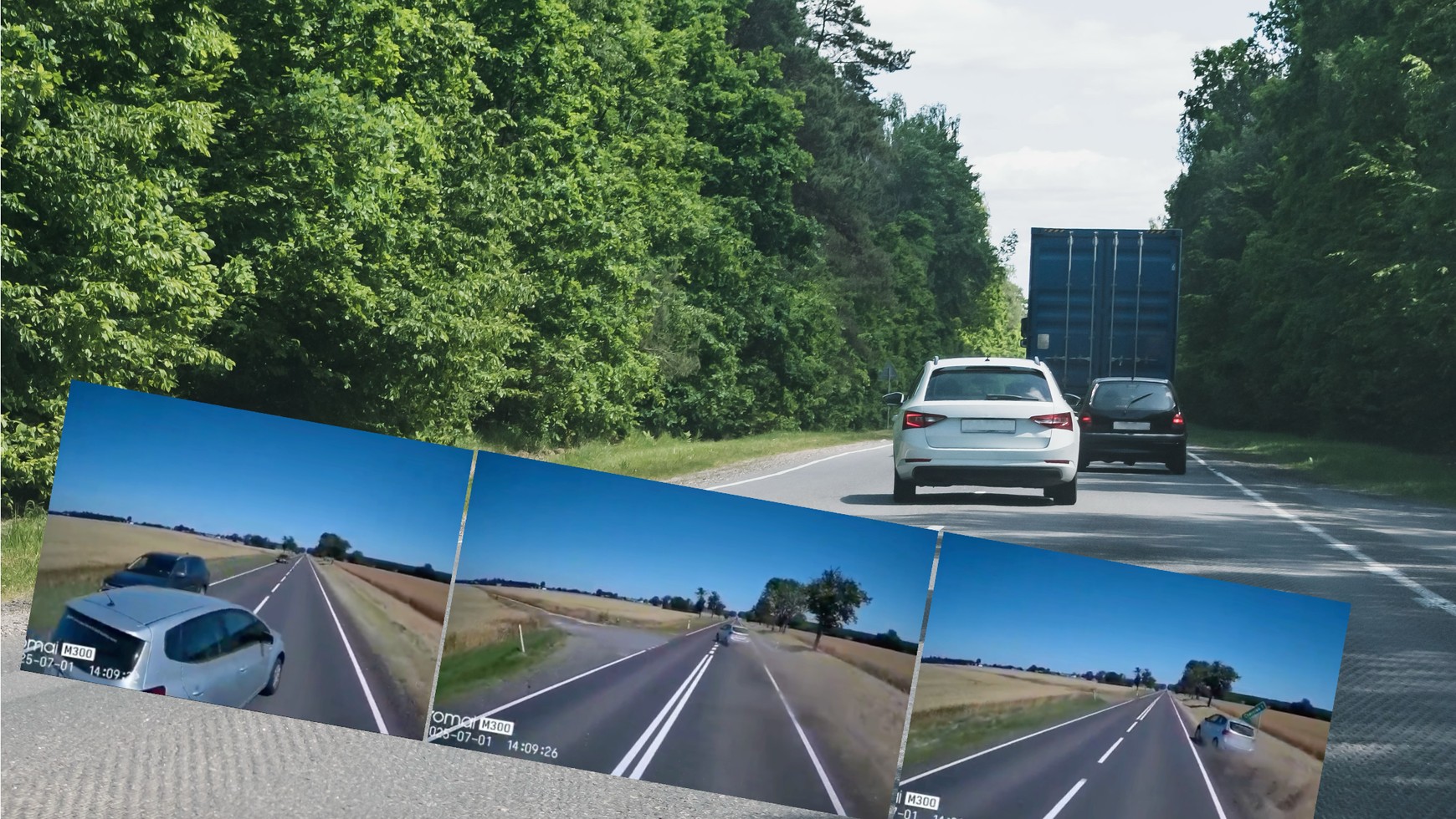 - W trakcie wyprzedzania zmusił innych kierowców do ucieczki na pobocze, zahaczył ciężarówkę, wpadnę na pobocze, skosił znak drogowy i wrócił na drogę