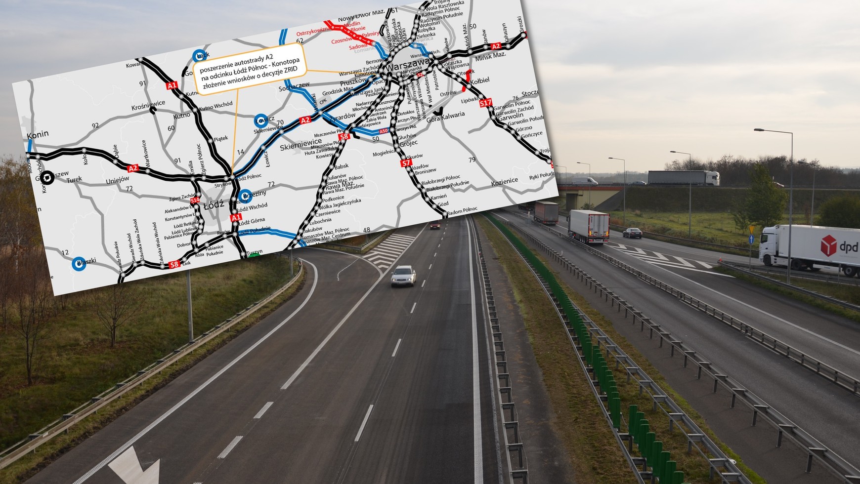Generalna Dyrekcja Dróg Krajowych i Autostrad złożyła wnioski o wydanie decyzji o zezwoleniu na realizację inwestycji drogowej na poszerzenie autostrady A2 Łódź - Warszawa o dodatkowe pasy ruchu - tzw. ZRID do Wojewody Łódzkiego i Wojewody Mazowieckiego.