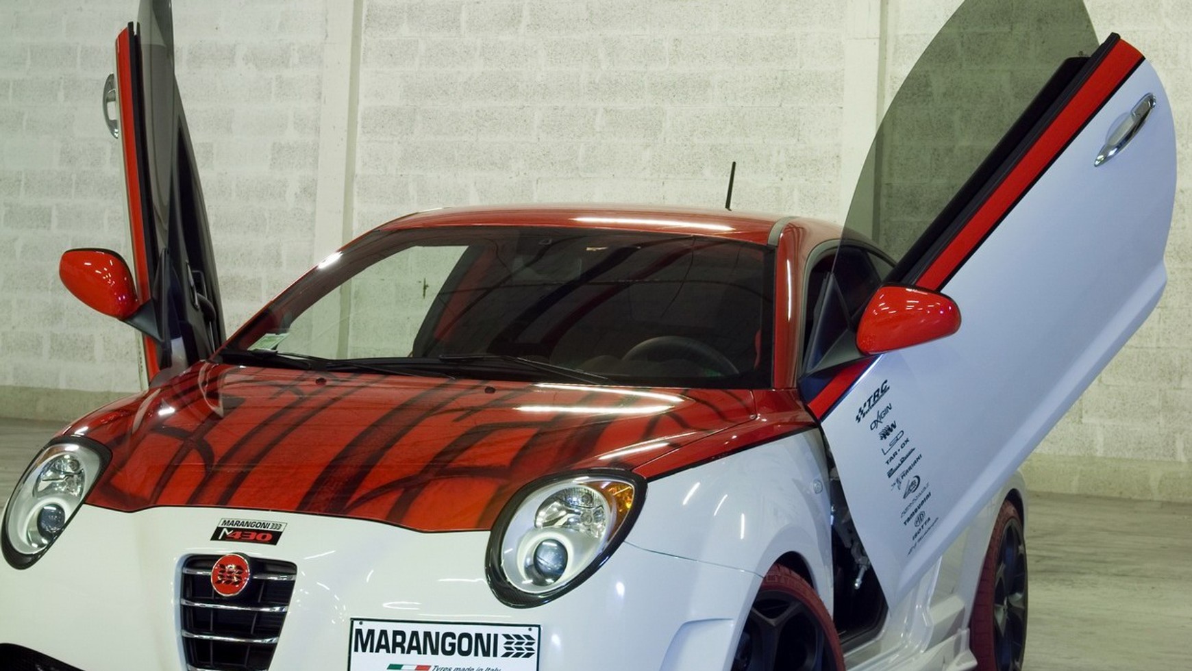 Co z tego wyszło? Standardowy silnik 1.4 napędzający MiTo osiągał maksymalnie 155 koni mechanicznych. To całkiem sporo jak na takie małe autko, jednak powszechnie wiadomo, że tunerzy nigdy nie mają dość. Po modyfikacjach turbiny, układu wydechowego oraz najprawdopodobniej elektroniki sterującej pracą jednostki napędowej osiągnięto wynik na poziomie 220 KM. Taka moc zobowiązuje – aby zapewnić autu lepsze prowadzenie w ciasnych zkrętach. Mała Alfa została obniżona, a standardowy system hamulcowy zastąpiono układem Tarox B33 wyposażonym w ogromne tarcze hamulcowe. Zmiany na zewnątrz pojazdu nawiązują do Ferrari F430. Przemodelowano przede wszystkim zderzaki, zarówno przedni jak i tylne odbiegają od tego co znamy z seryjnej wersji auta, a nawiązują do stylu prezentowanego przez tak zwane super wozy. Nie brakuje wstawek z karbonu, jednak najbardziej rzucającym się w oczy elementem są drzwi otwierane a’la Lamborghini. Ciekawostką są również czerwone opony Mythos w rozmiarze 225/35 założone na piękne, osiemnastocalowe aluminiowe felgi Oxigin Crystal Black. Również wnętrze wygląda imponująco. Wykończenie zmodyfokowanego wnętrza stoi na bardzo wysokim poziomie zarówno pod względem wykonania jak i użytych materiałów. Oryginalnym rozwiązaniem są: gałka lewarka zmiany biegów, pedały oraz dźwignia hamulca ręcznego wykonane przez firmę Isotta przy użyciu szlachetnych kamieni od Swarovskiego.