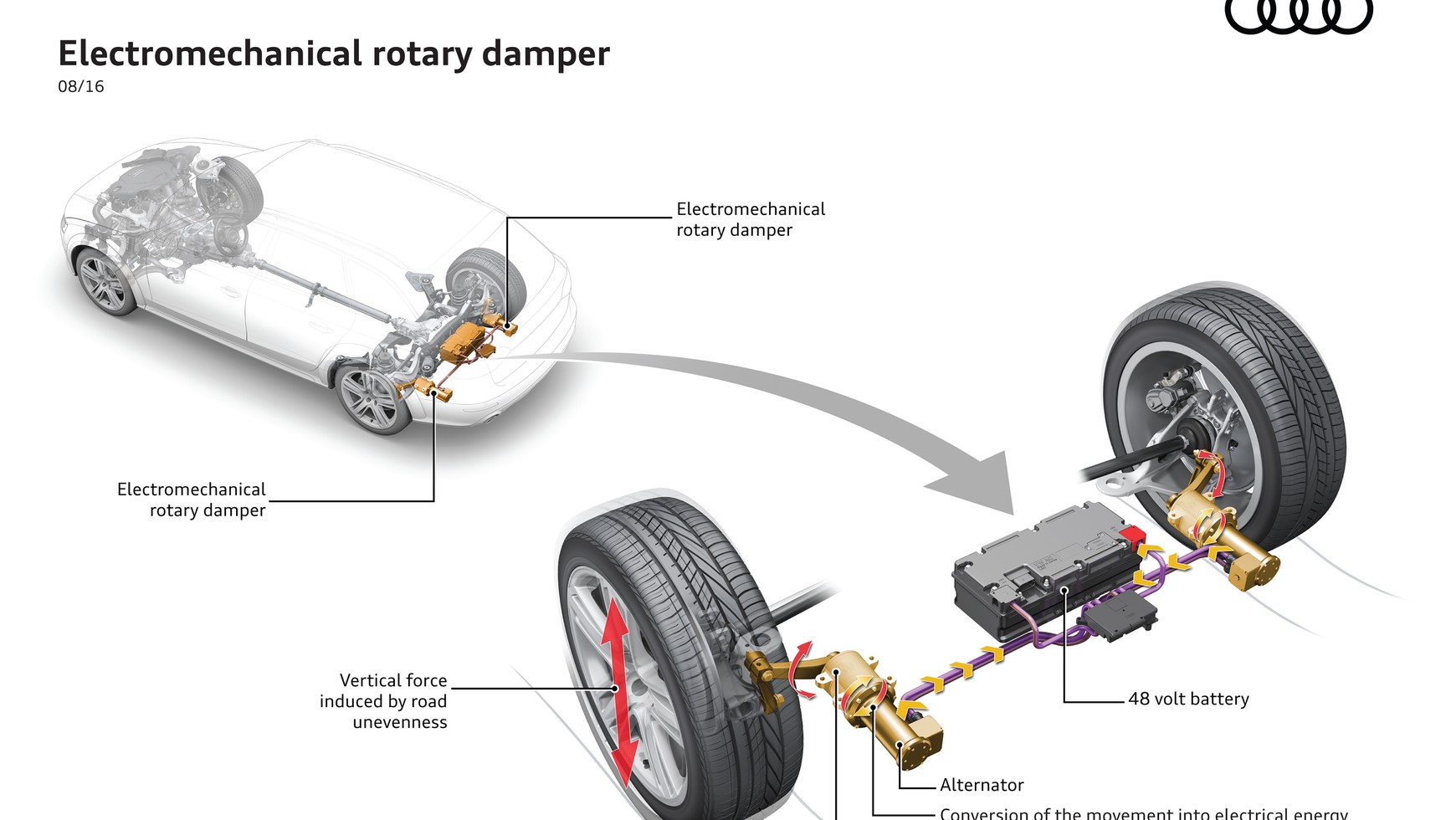 - Każda wyrwa, każdy wybój, każdy zakręt dostarcza autu energii kinetycznej, która w obecnie używanych amortyzatorach jest absorbowana, a następnie oddawana w postaci ciepła. Nowy, elektromechaniczny system amortyzatorów wykorzystuje tę energię w całości, przesyłając ją do instalacji elektrycznej auta o napięciu 48 V - mówi dr inż. Stefan Knirsch, członek zarządu Audi AG ds. rozwoju technicznego.