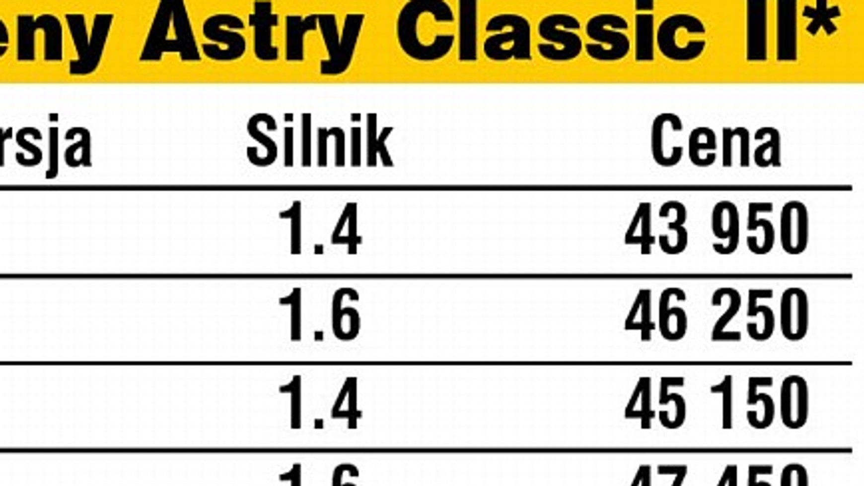 Wyposażenie podstawowe gliwickiej Astry obejmuje: wspomaganie układu kierowniczego, poduszkę powietrzną kierowcy, ABS oraz immobiliser. Astry z Gliwic nie są objęte programem sprzedaży zbiorowej. Auto może być wyposażone w jeden z dwóch silników benzynowych (1.4/90 KM i 1.6/100 KM). Od kwietnia ma się pojawić również diesel Common Rail o pojemności 1,7 l i mocy 80 KM.