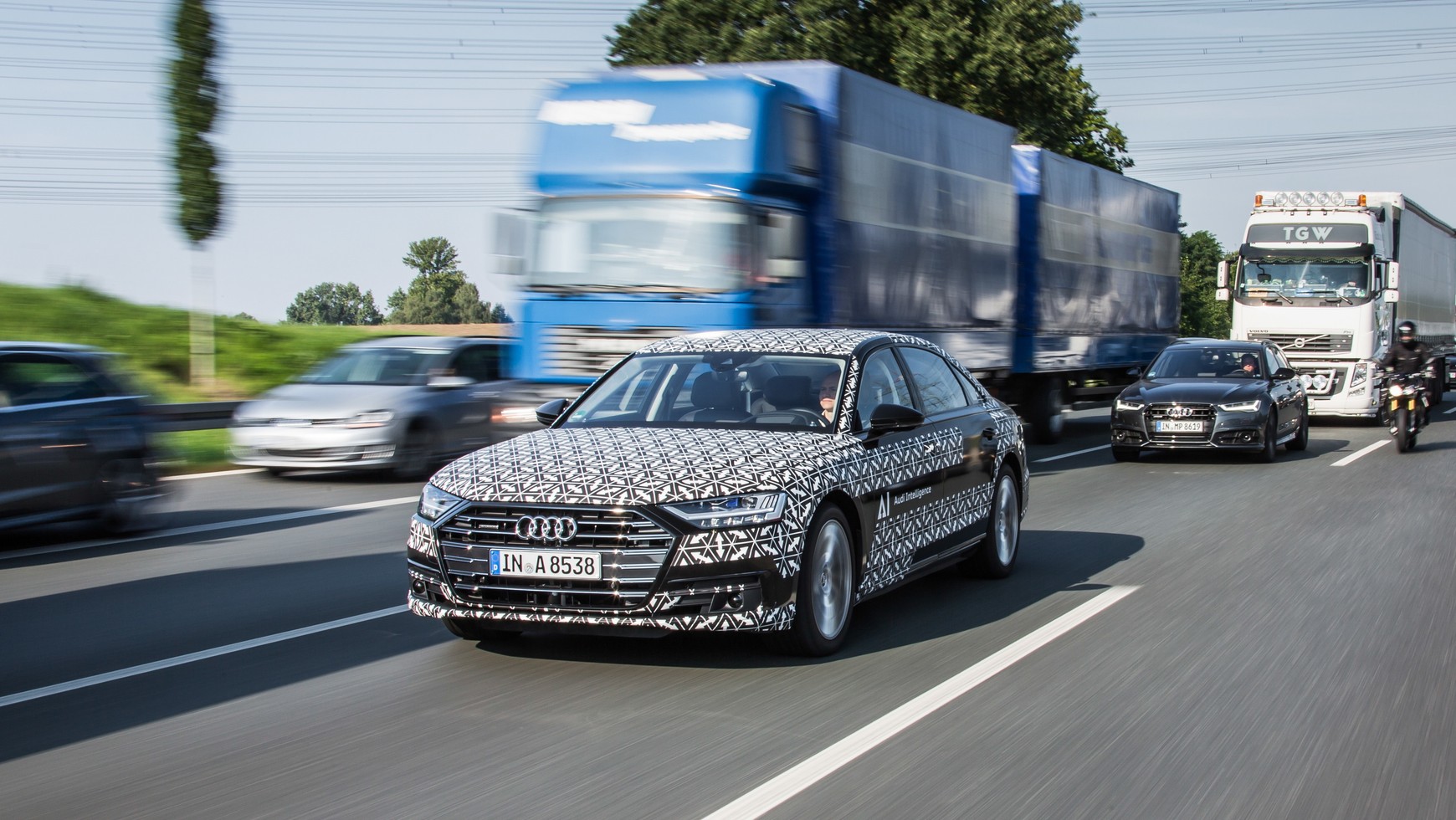 W sytuacji, gdy nowe Audi A8 porusza się w szyku „jeden za drugim” po jezdni autostrady lub drogi szybkiego ruchu z barierami odgradzającymi przeciwległe pasy ruchu i z prędkością nie przekraczającą 60 km/h, pilot jazdy w korkach Audi AI przejmuje zadanie prowadzenia pojazdu. W takiej sytuacji zarządza ruszaniem, przyspieszaniem, manewrowaniem i zwalnianiem w granicach obranego pasa ruchu. Radzi sobie również z nagłymi sytuacjami, np. z takimi gdy inny pojazd wjeżdża na pas tuż przed naszym Audi. Sygnały sterujące, których system potrzebuje dla zautomatyzowanej jazdy, pozyskiwane są z centralnego sterownika systemu wsparcia kierowcy (zFAS) oraz metodą wtórnej fuzji danych ze sterownika czujników radarowych.