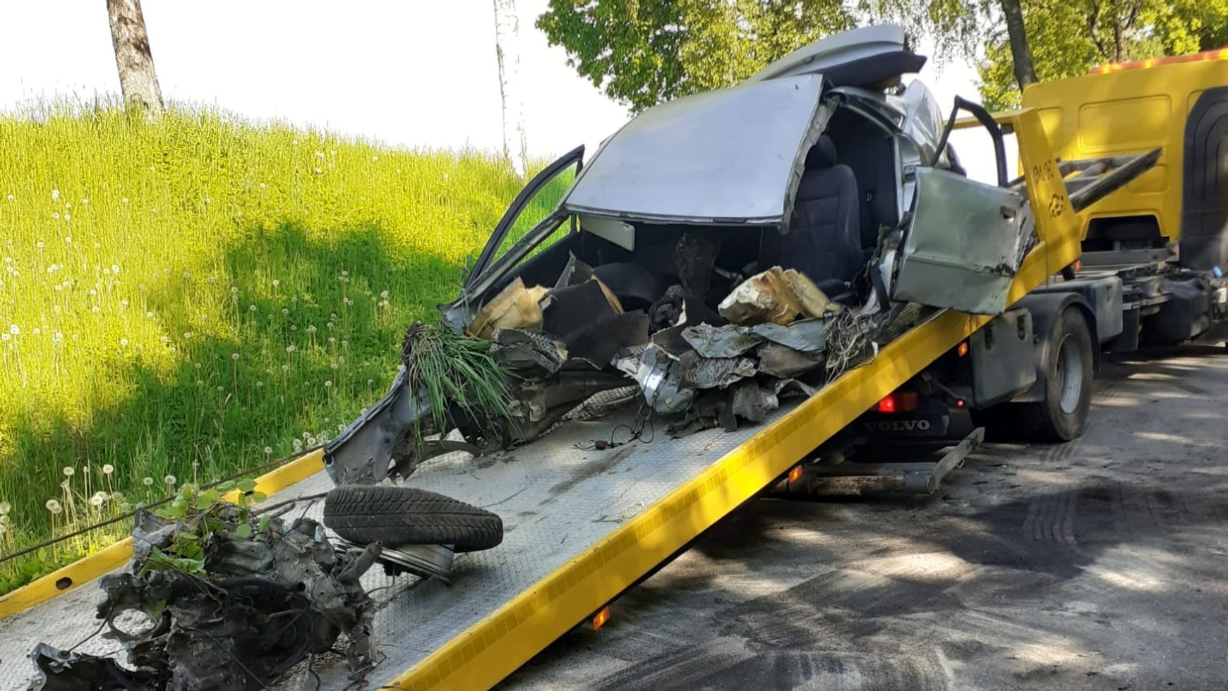 Na zdjęciach straży pożarnej z miejsca zdarzenia widać, jak drastyczne były skutki wypadku - samochód rozpadł się na dwie części, a mniejsze elementy pojazdu odłamały się od większych.