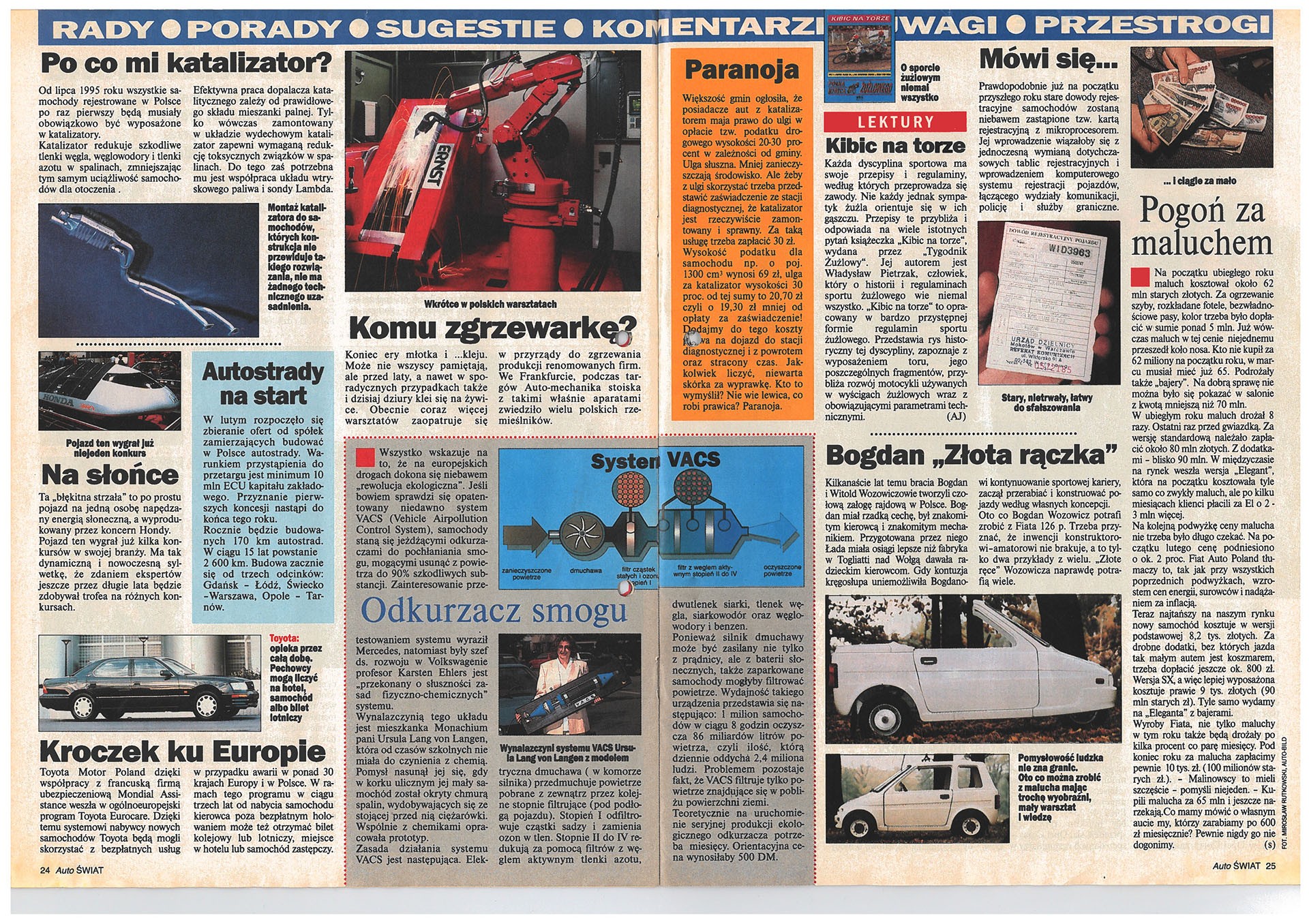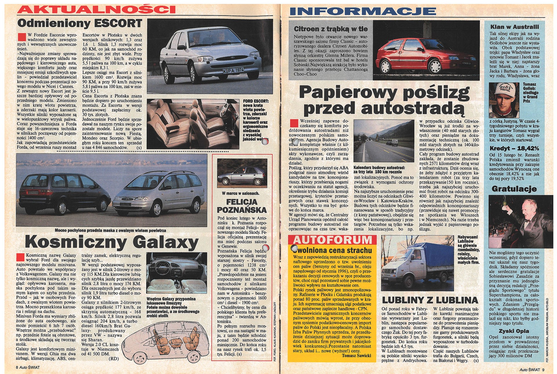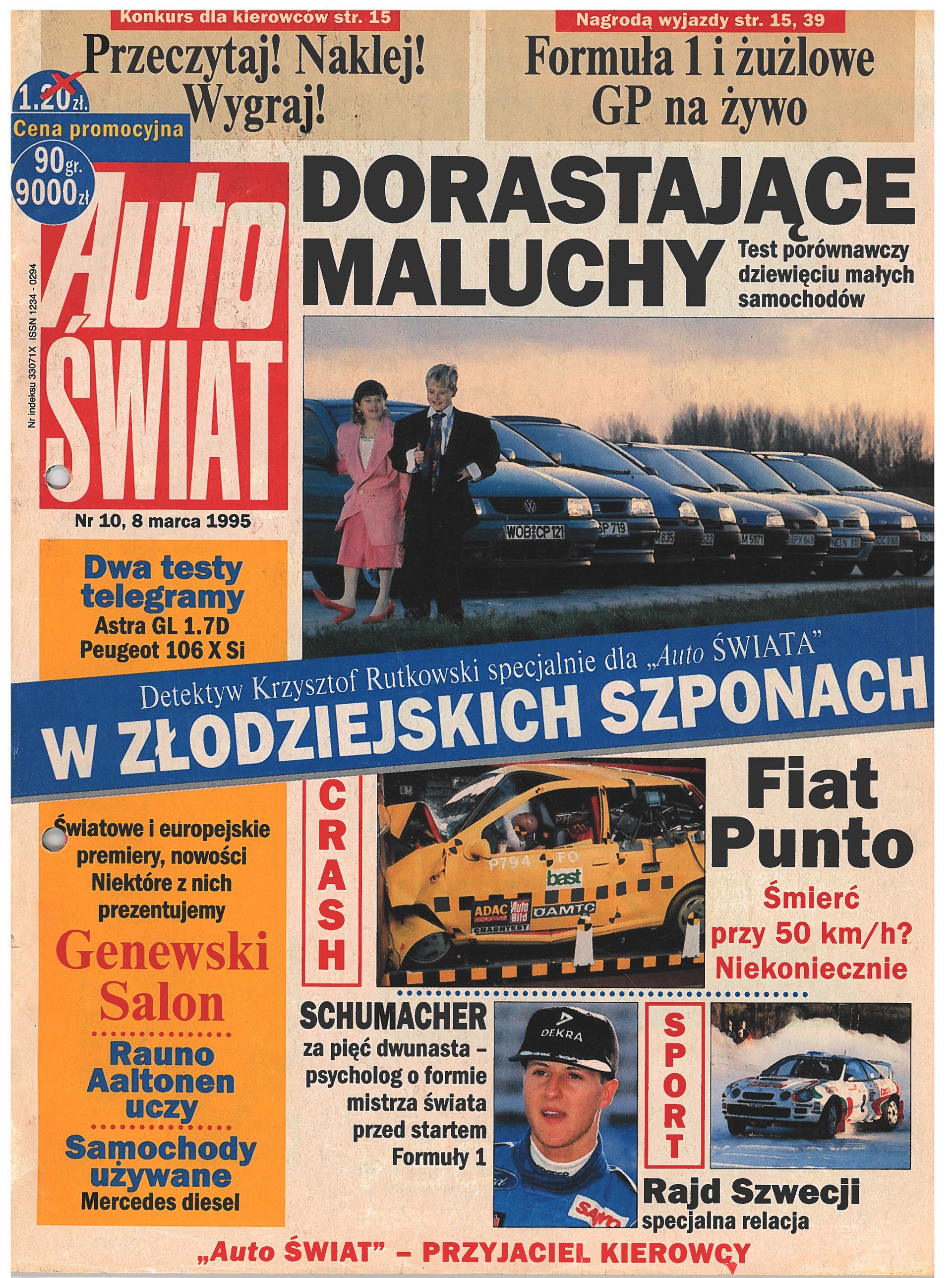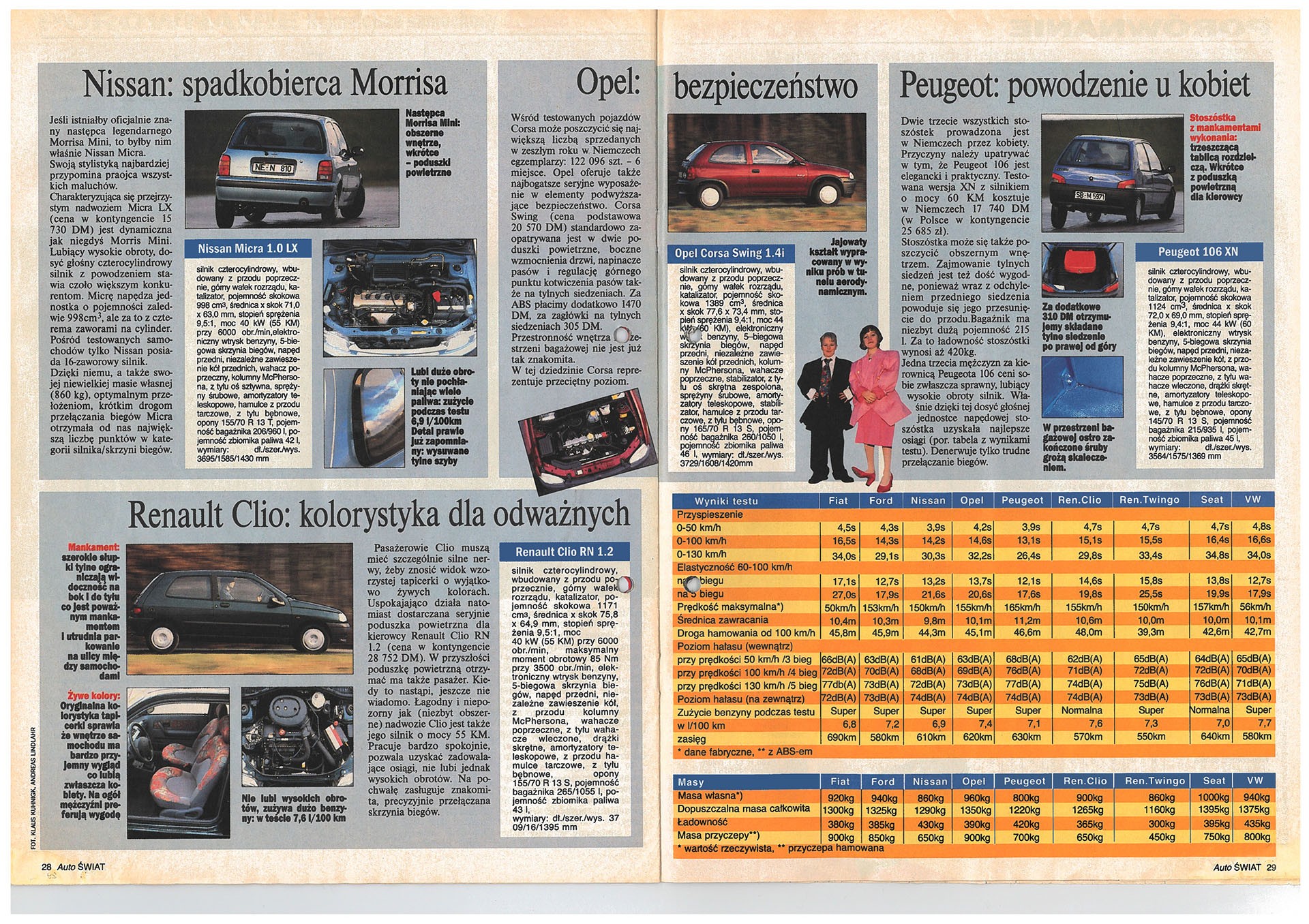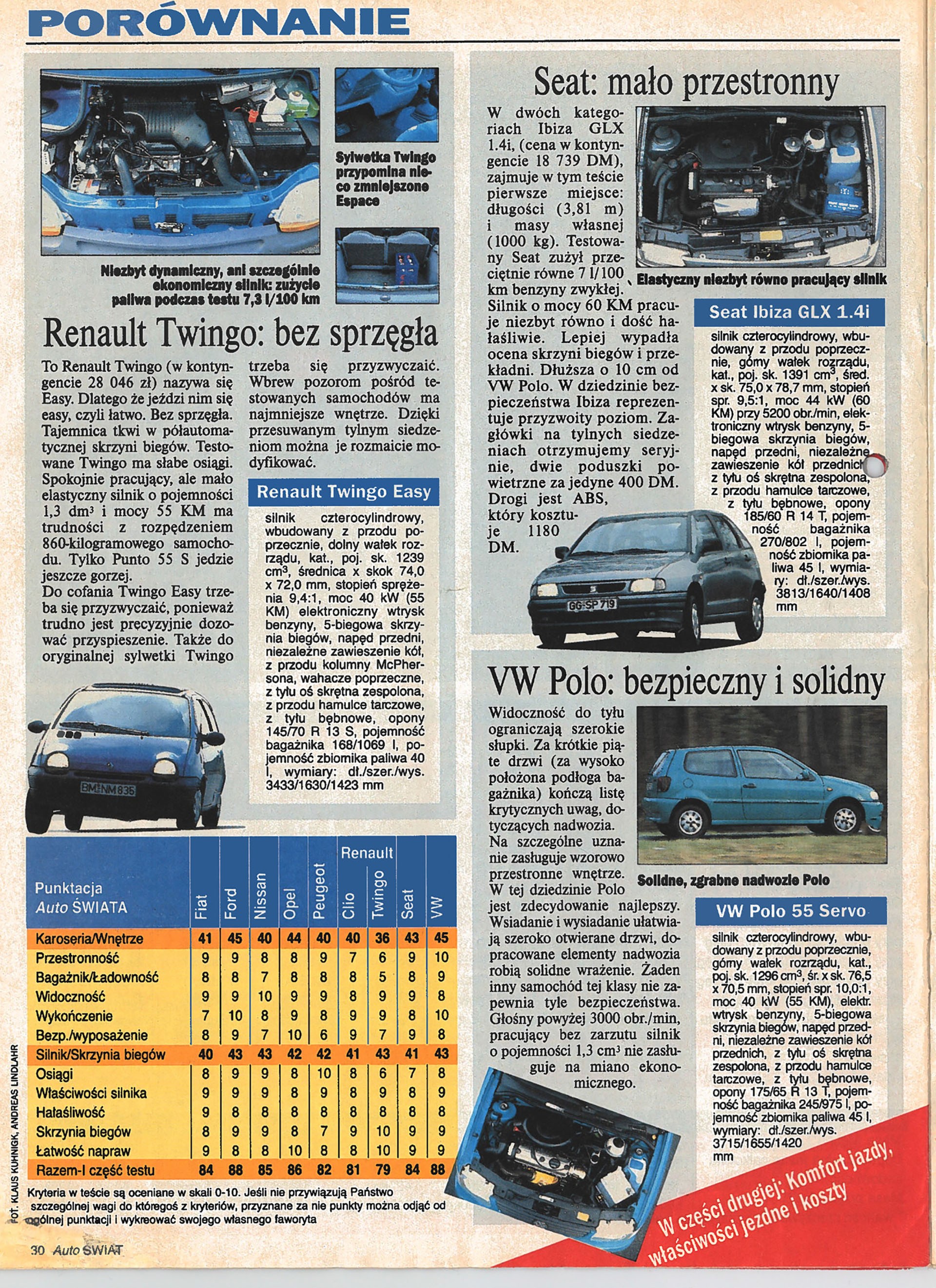 W pierwszym numerze „Auto Świata” zamieściliśmy obszerny test porównawczy 9 małych samochodów: Fiata Punto, Forda Fiesty, Nissana Micry, Renault Clio, Opla Corsy, Peugeota 106, Renault Twingo, Seata Ibizy i VW Polo. To też była absolutna nowość – nikt przed nami nie testował tylu aut naraz i nikt nie przedstawiał tak dokładnych danych na temat: przyspieszenia, elastyczności, drogi hamowania, spalania.