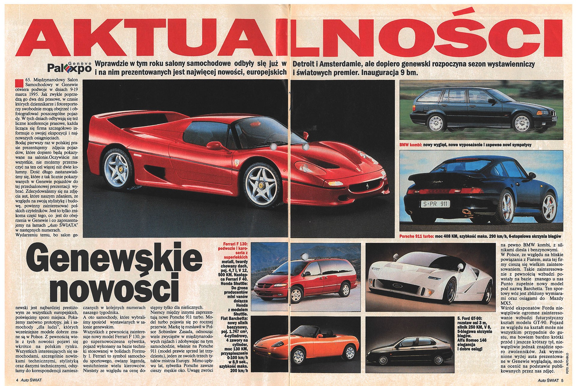 O czym pisaliśmy w pierwszym numerze „Auto Świata”? Numer otwierał artykuł „Genewskie nowości”, w którym opisaliśmy najciekawsze modele zapowiedziane na 65. salon w Genewie (zaczynał się 9 marca), m.in. Ferrari F130, BMW kombi, Forda GT-90, Alfę Romeo 147, Fiata Barchettę, Porsche 911 turbo. Po raz pierwszy w polskiej prasie motoryzacyjnej zaprezentowaliśmy auta, które dopiero miały być pokazane. Dziś to normalne, ale 25 lat temu był to szok.