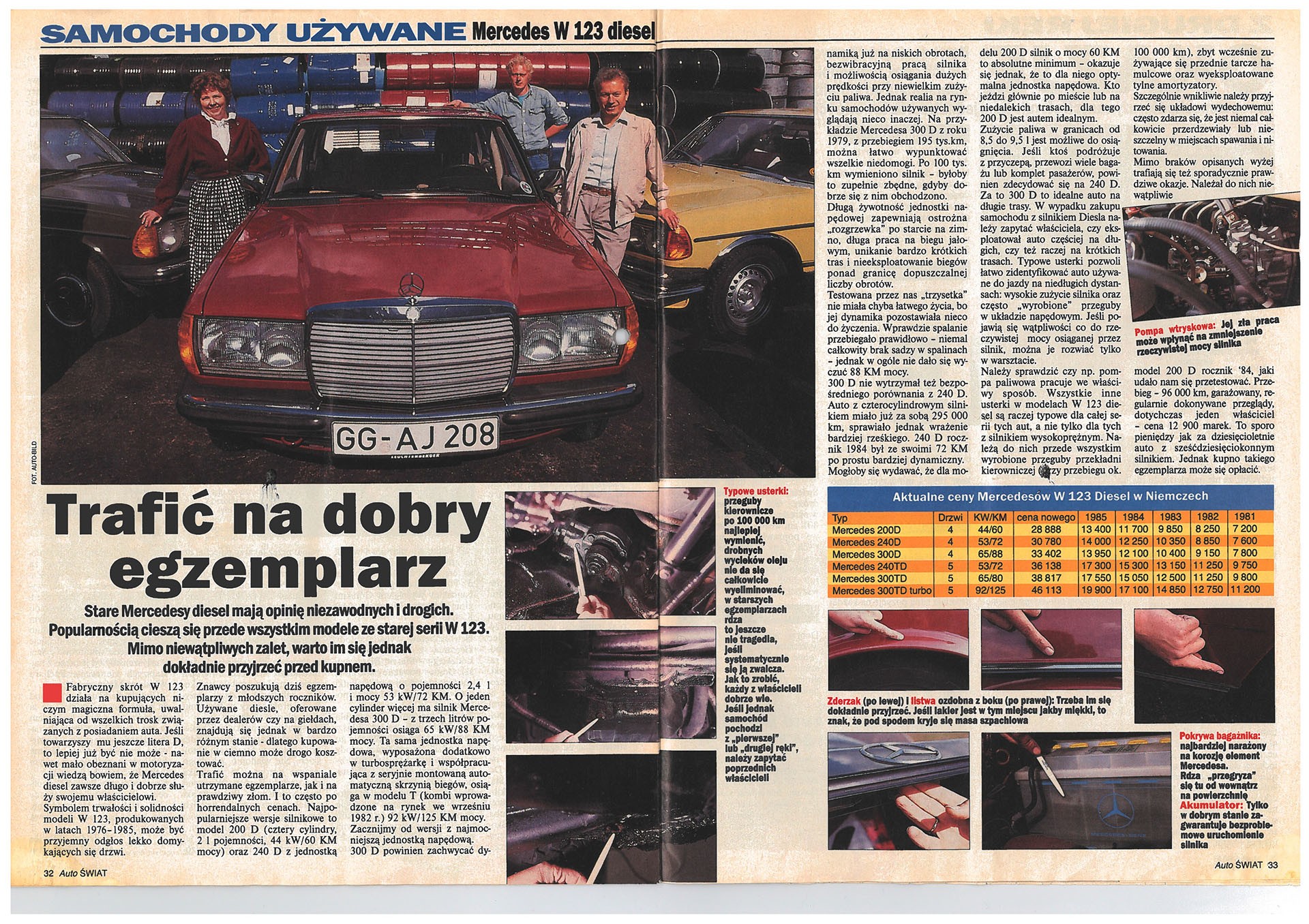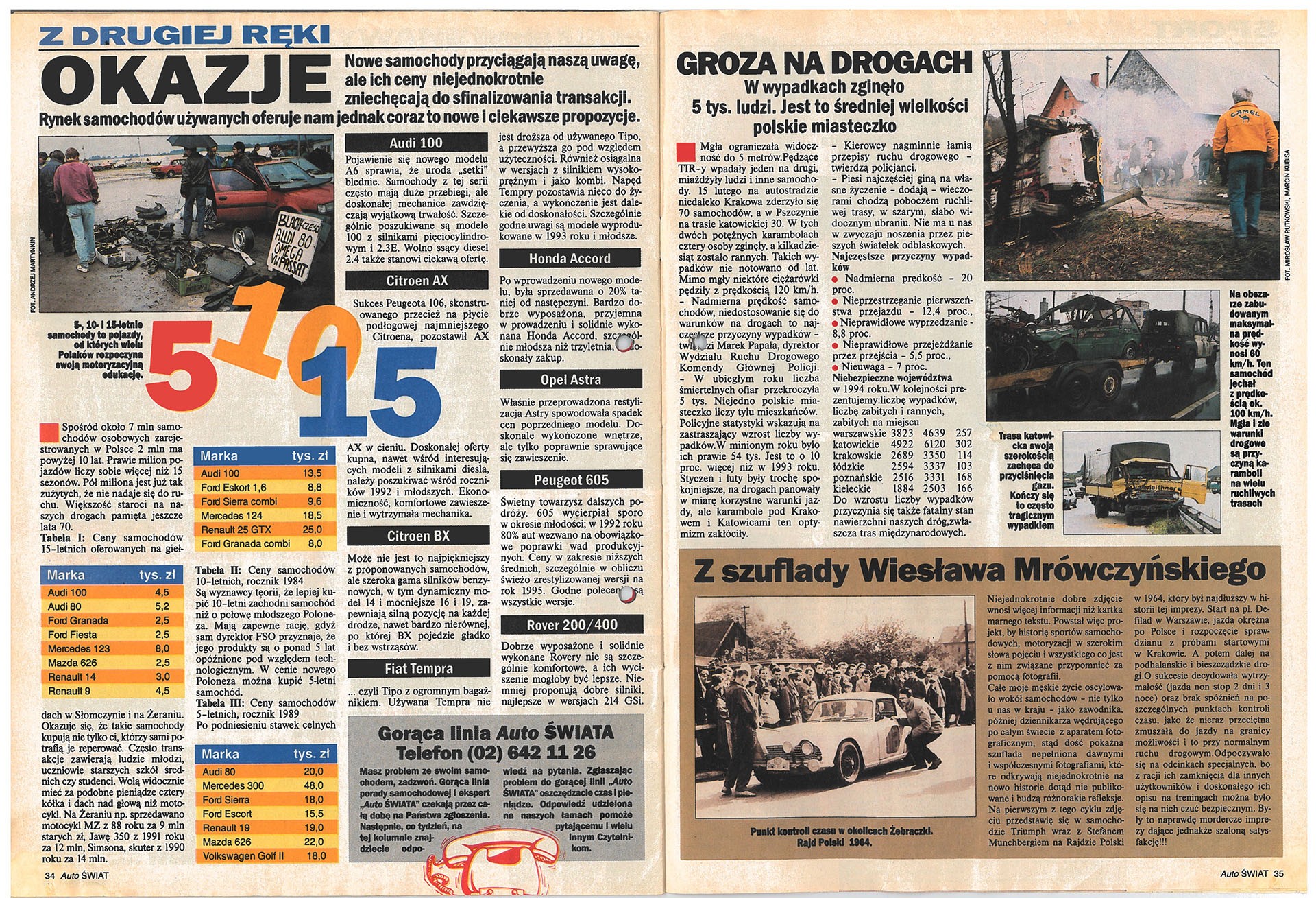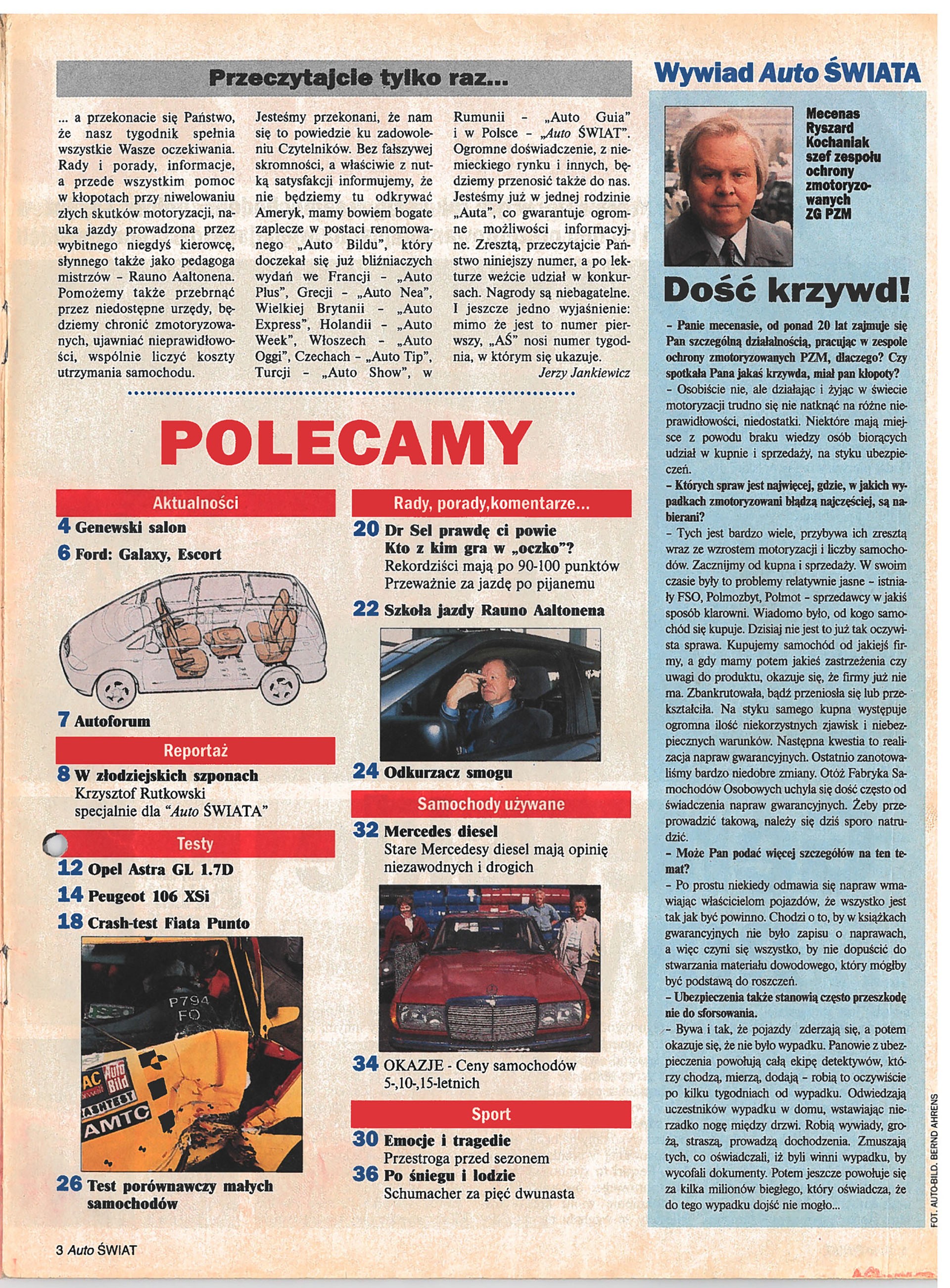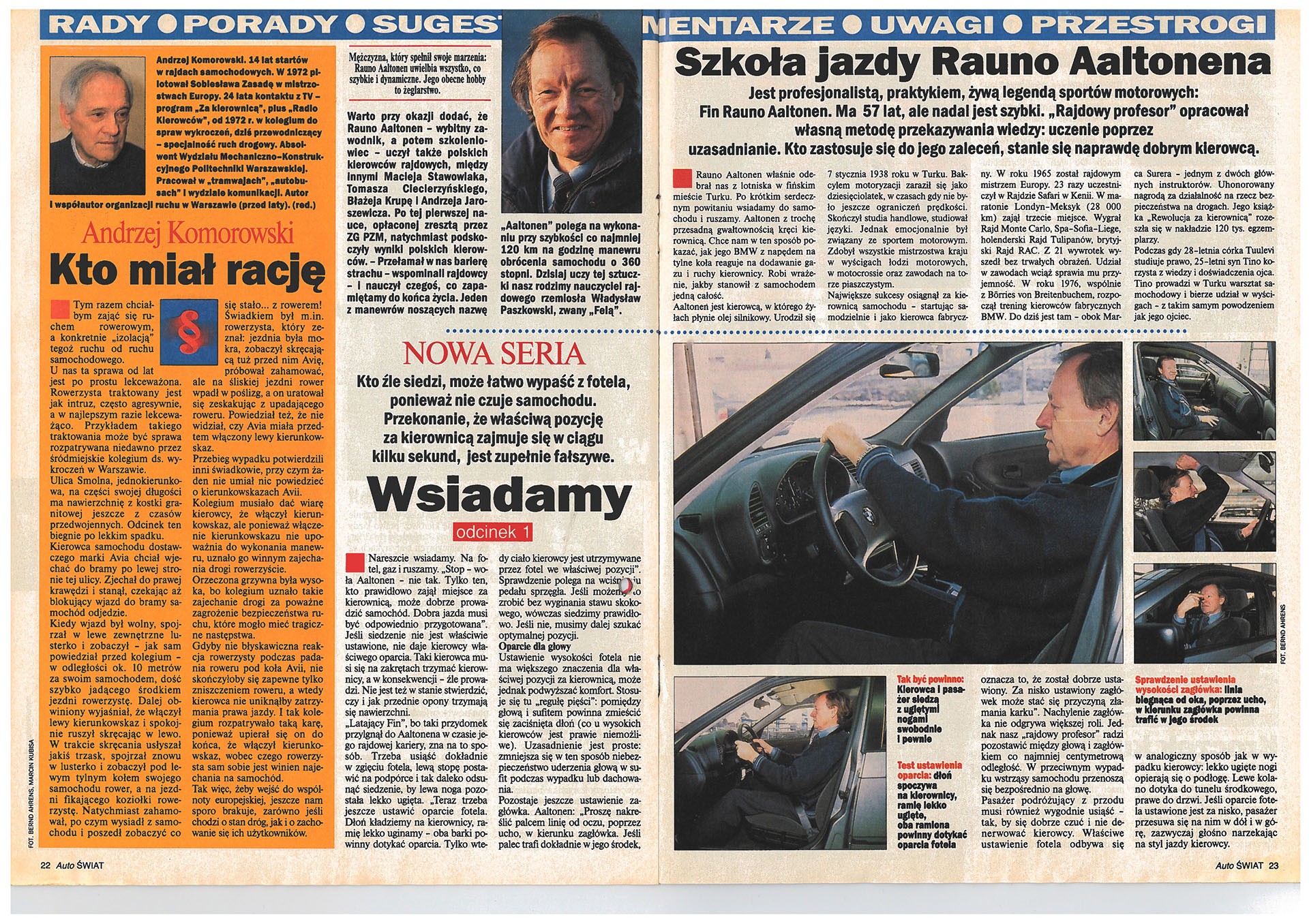 Od początku istnienia „Auto Świata” dużą wagę przykładaliśmy do aut używanych. W pierwszym numerze przedstawiliśmy ówczesne marzenie polskich kierowców – Mercedesa W123 z silnikiem Diesla. Bardzo obszerny i interesujący był dział „Porady”. Nasi Czytelnicy mogli w nim znaleźć informacje na tematy eksploatacyjne, prawne, nowych wydawnictw motoryzacyjnych, a także… muzyki dla kierowców. W pierwszym numerze rozpoczęliśmy, cieszący się wielkim powodzeniem wśród naszych Czytelników, cykl „Szkoła jazdy Rauno Aaltonena”. Słynny fiński kierowca rajdowy wcześniej uczył techniki jazdy polskich kierowców (m.in. Macieja Stawowiaka, Błażeja Krupę, Andrzeja Jaroszewicza), a teraz podobny kurs – na łamach „Auto Świata” – mieli okazję zaliczyć nasi Czytelnicy.