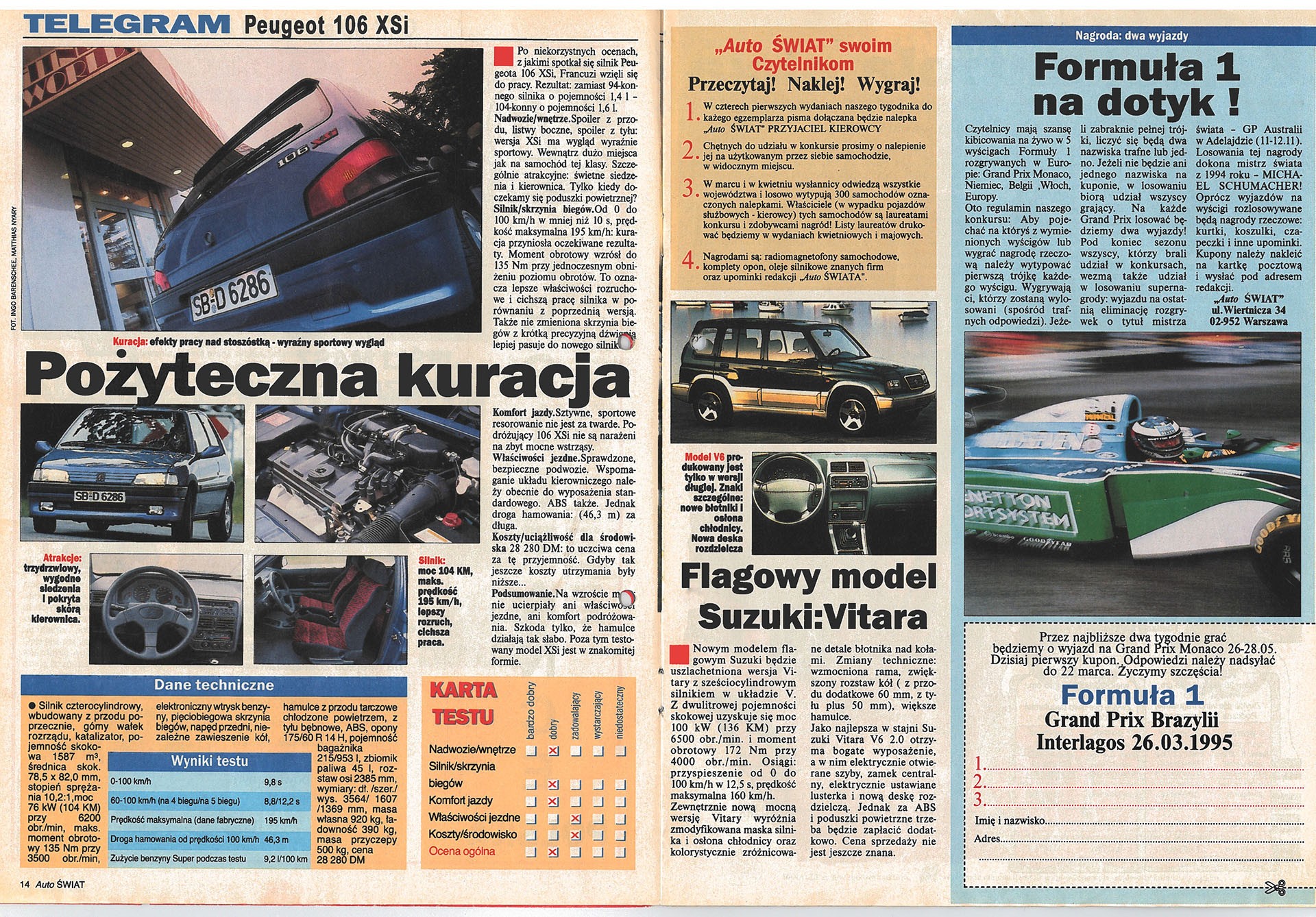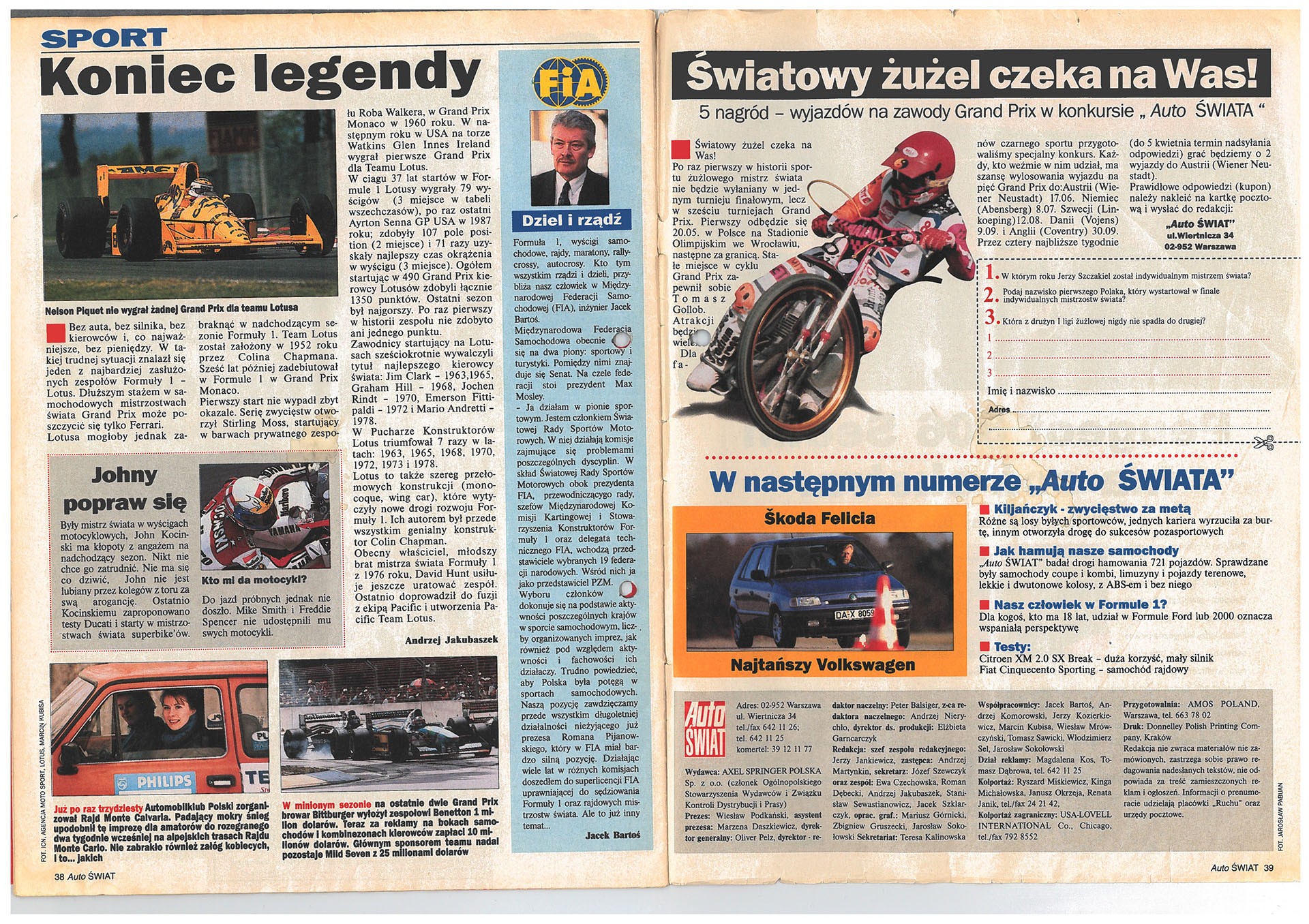 Specjalnością „Auto Świata” były też konkursy i plebiscyty. Już w pierwszym roku naszej działalności ogłosiliśmy konkurs „Auto nr 1” . Czytelnicy w pierwszym etapie wybierali najlepsze nowe auto na rynku polskim, a w drugim etapie – na szczeblu europejskim – jury złożone ze specjalistów, kierowców wyścigowych i redaktorów naczelnych pism rodziny „Auto Bilda” wybierało najlepsze auto roku. Nagrody w tych konkursach były bardzo atrakcyjne – samochody osobowe, sprzęt audio, foto, akcesoria samochodowe. W 1995 r. główną nagrodą w konkursie „Auto 1” było Audi 80.