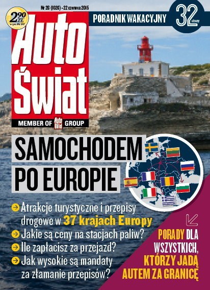 Numer 26/2015 „Auto Świata” ukazuje się z 32-stronicowym dodatkiem turystycznym „Samochodem po Europie”. To kompendium wiedzy przydatne dla wszystkich, którzy wybierają się autem za granicę. Znajdziecie tam informacje jak przygotować się do dłuższej podróży, jakie ubezpieczenia będą potrzebne, jakie są przepisy drogowe, ceny paliw i autostrad oraz kary za wykroczenia w 38 krajach.