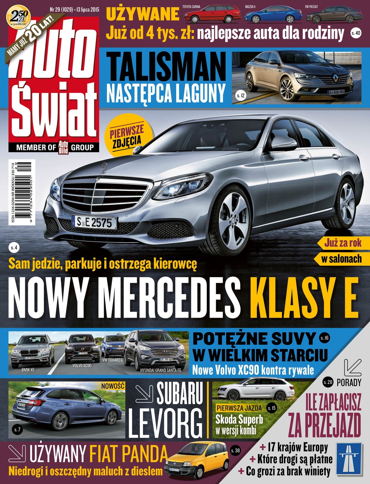 AKTUALNOŚCI – pierwsze zdjęcia nowego Mercedesa klasy E, który zadebiutuje w 2016 r.; kombi, które zastąpi Subaru Legacy, Renault Talizman – nowa broń francuskiego koncernu oraz pierwsza jazda nowa Skodą Super Combi.