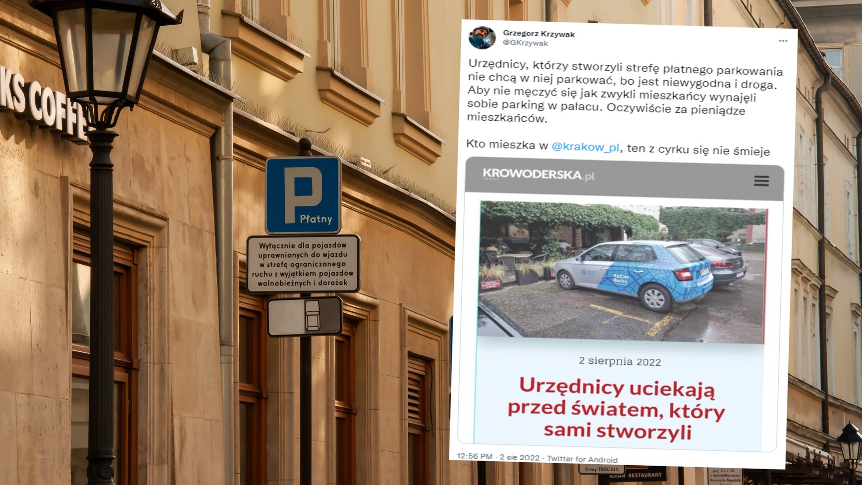Krakowscy urzędnicy, którzy ograniczają ruch samochodowy w mieście, wynajęli parking w ścisłym centrum (screen: Twitter.com/GKrzywak)