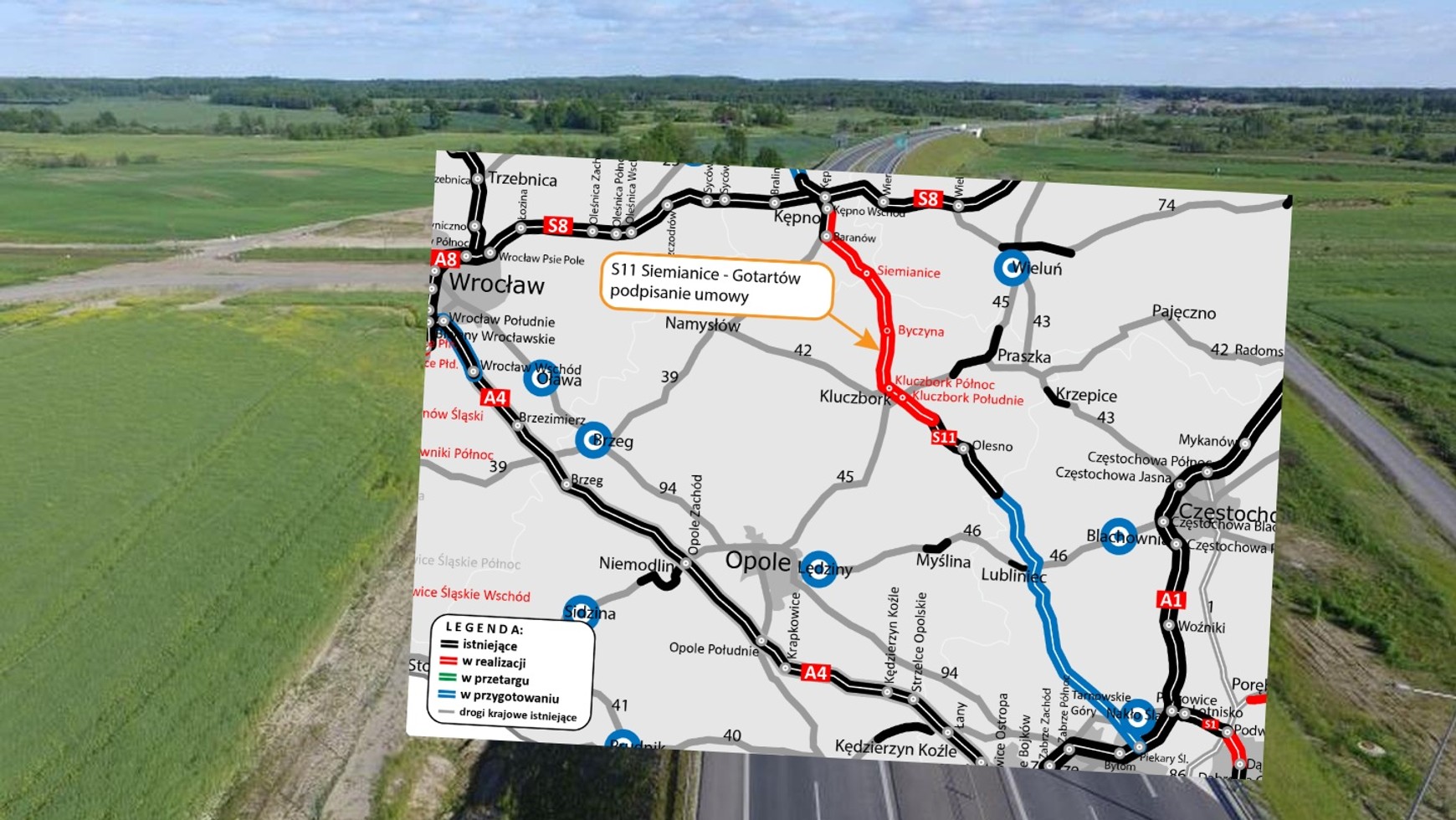 Generalna Dyrekcja Dróg Krajowych i Autostrad (GDDKiA) podpisała teraz umowę na budowę fragmentu drogi S11 pomiędzy Siemianicami i Gotartowem o długości 23 km. Jak informuje GDDKiA, to jeden z trzech odcinków 46-kilometrowej trasy, która połączy trzy województwa: wielkopolskie, łódzkie i opolskie.