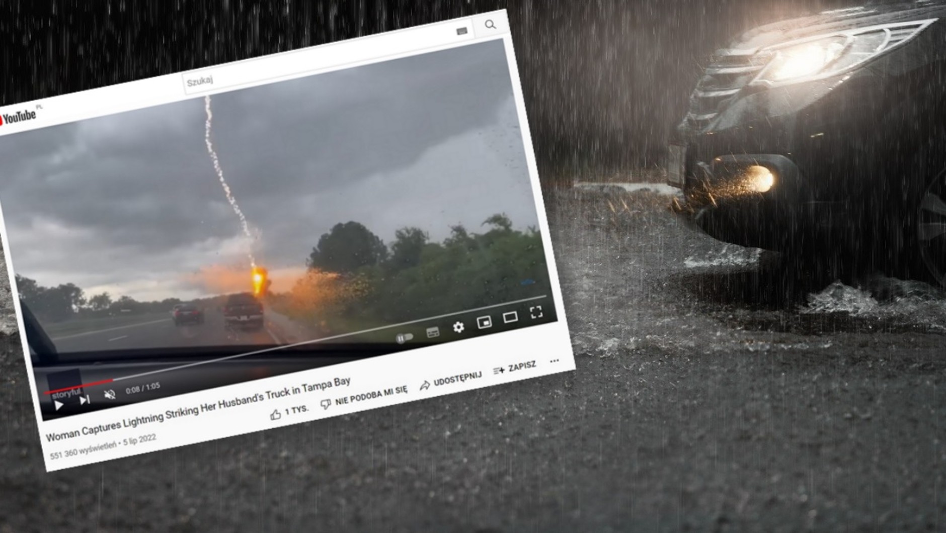Nagranie opublikowane na kanale WFLA News Channel 8 na YouTubie wygląda jak scena wyjęta z dreszczowca. Nad przejeżdżającymi autostradą pojazdami wiszą ciemne chmury i szaleje burza, a w pewnym momencie błyskawica uderza bezpośrednio w samochód jadący przed nagrywającą kobietą. Z opisu sytuacji opublikowanego przez "The Washington Post" dowiadujemy się, że kierownicą tego auta siedział mąż autorki wideo, a w środku były też jej dzieci.