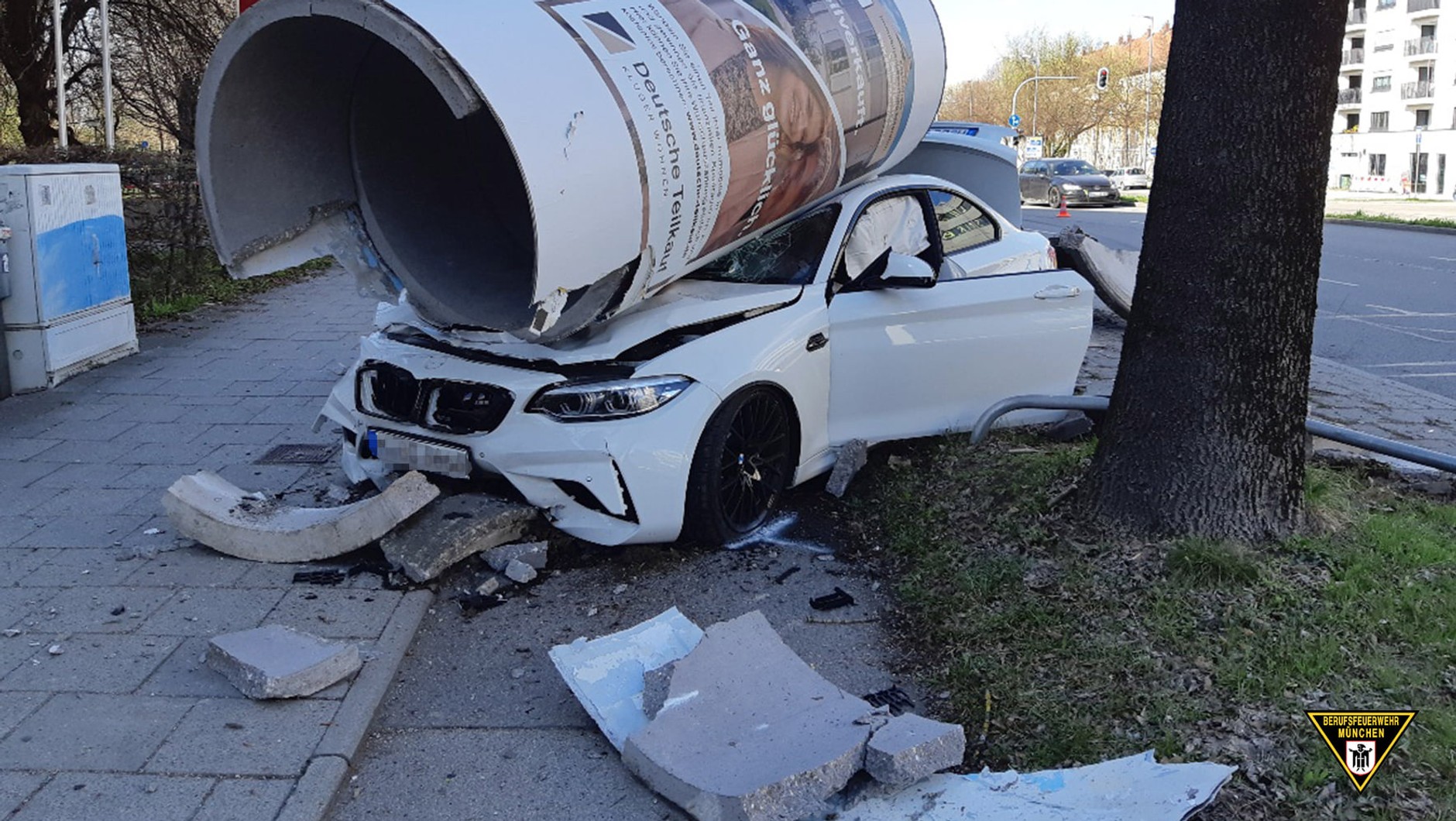 Do dość spektakularnego wypadku doszło na Leopoldstrasse w Monachium. Białe BMW M2, które jest dość trudnym do okiełznania samochodem, wylądowało poza drogą, zaraz za skrzyżowaniem, z którego ruszyło. Auto uderzyło na chodniku w betonowy słup ogłoszeniowy, który przygniótł auto.