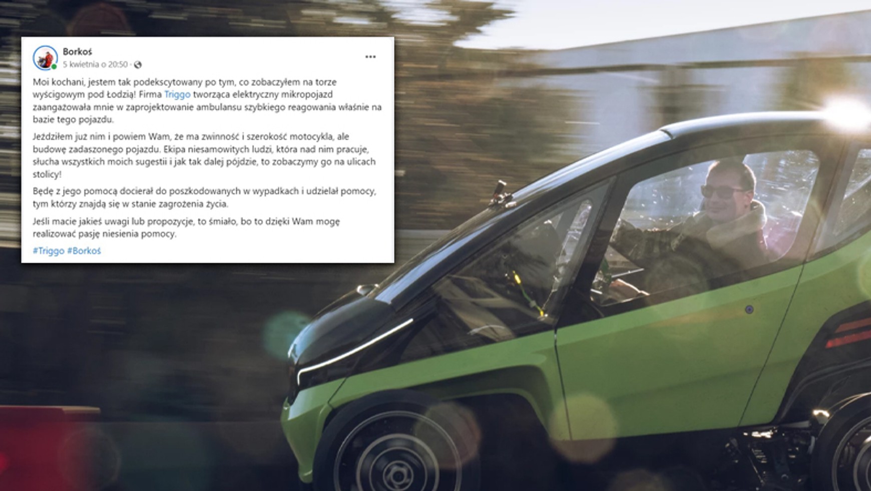 "Jeździłem już nim i powiem Wam, że ma zwinność i szerokość motocykla, ale budowę zadaszonego pojazdu. Ekipa niesamowitych ludzi, która nad nim pracuje, słucha wszystkich moich sugestii i jak tak dalej pójdzie, to zobaczymy go na ulicach stolicy!" – ekscytuje się znany ratownik.