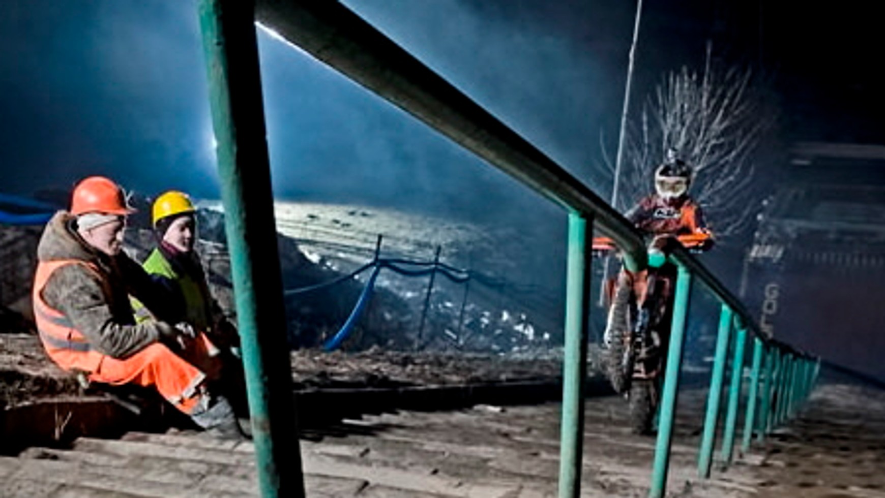Trasa nietypowego, nocnego wyścigu – ustalona wspólnie przez zawodników - wiodła przez przyszłą płytę boiska, klatki schodowej, koronę stadionu i inne naturalne industrialne elementy znajdujące się w pobliżu budowy. Na metę wyznaczono legendarny tunel Stadionu X-lecia, przez który wielokrotnie przejeżdżał Wyścig Pokoju. O kolejności startu zadecydował rzut monetą – los uśmiechnął się do Ronniego Rennera, który brawurowo rozpoczął przejazd po niezwykłym torze. Błażusiak początkowo zostawał w tyle, wkrótce dogonił Rennera i przez resztę trasy szli "łeb w łeb." W rezultacie na metę wyznaczoną przez jedną z bram wjazdowych na teren budowy wjechali w tym samym czasie.