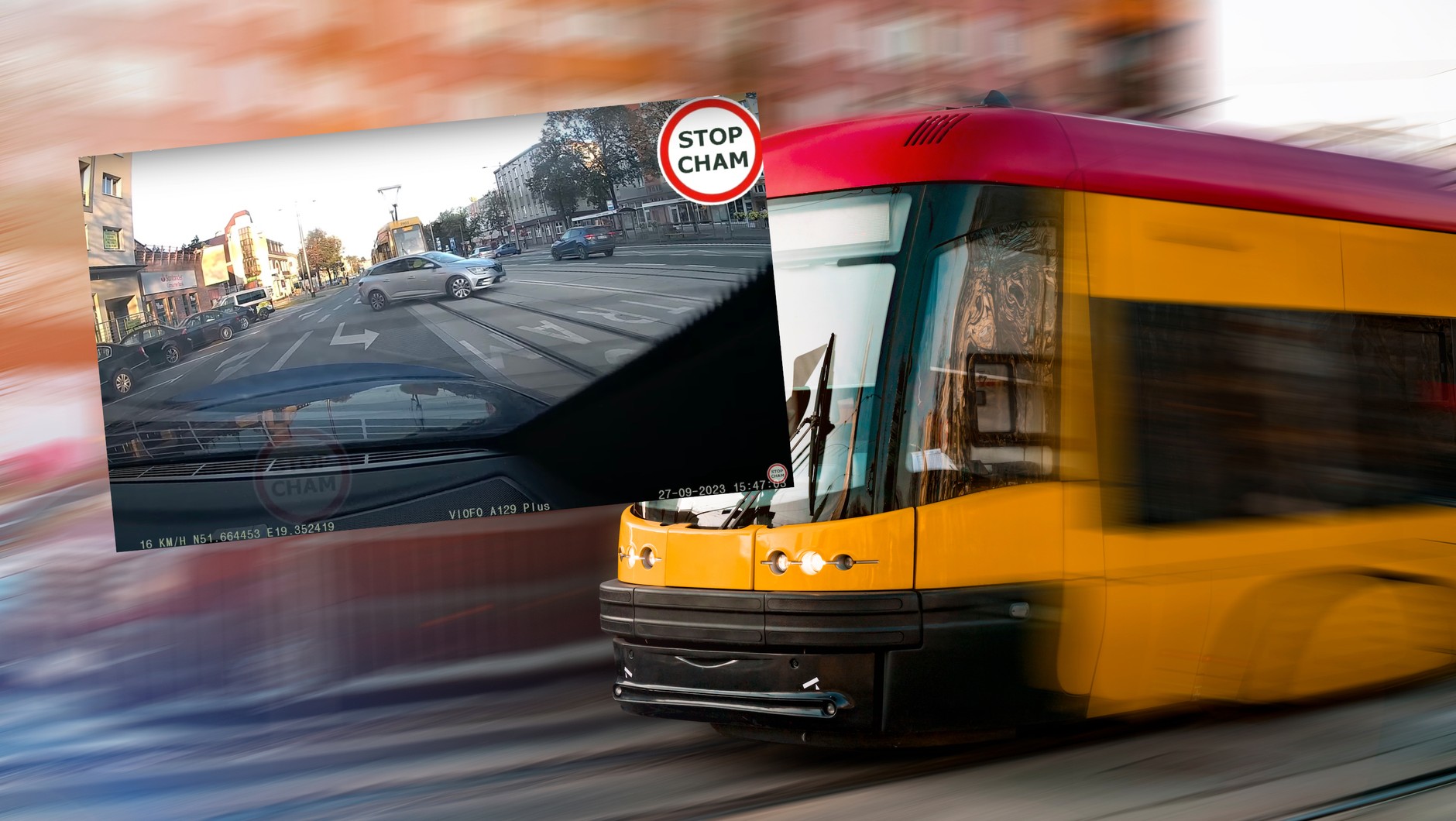 To była zła decyzja nie tylko ze względu na złamanie przepisów drogowych. Kierowca srebrnego auta nie rozejrzał się dokładnie i wjechał wprost pod nadjeżdżający tramwaj. Ten uderzył w tylną część samochodu i spowodował jego obrót.