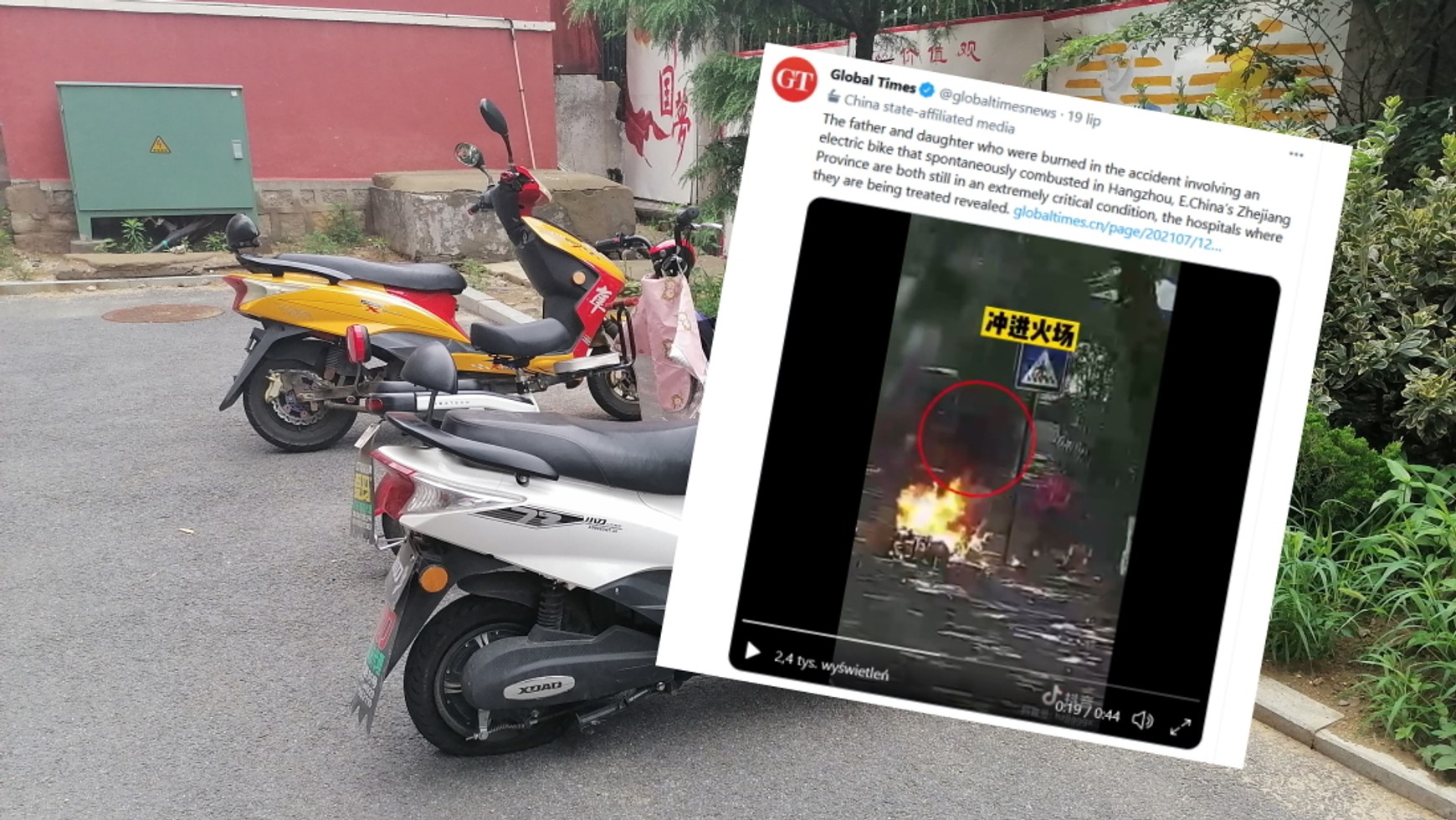 Według informacji chińskiego dziennika "Global Times", w niedzielę 18 lipca w położonym na wschodzie Chin Hangzhou doszło do samozapłonu elektrycznego skutera. W wyniku wybuchu oraz pożaru jednośladu, ciężkich obrażeń doznali jadący nim mężczyzna Wei Shunli i jego 7-letnia córka Wei Jiaqi. Dramatyczna sytuacja została nagrana przez miejski monitoring.