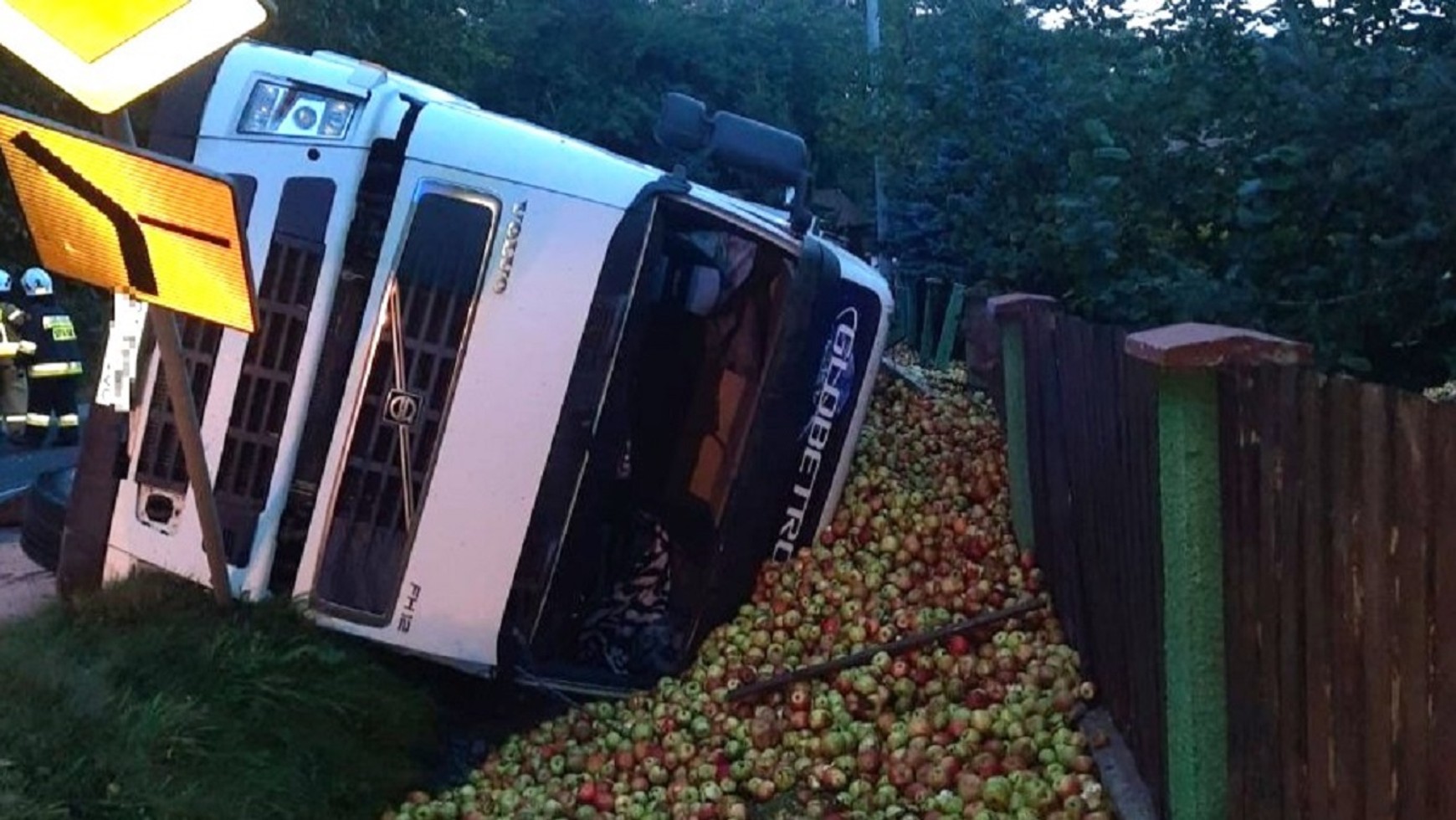 Do tej kuriozalnej kolizji doszło w piątek 22 września na DW 768 w miejscowości Przyborów (woj. małopolskie). Wieczorem przejeżdżał przez nią kierowca ciężarówki z naczepą wyładowaną po brzegi świeżo zebranymi jabłkami. Z niewyjaśnionych jeszcze przyczyn na łuku drogi zjechał do rowu i... dostarczył 24 tony jabłek przypadkowym klientom. Ciężarówka się wywróciła, wysypując jabłka na prywatną posesję.