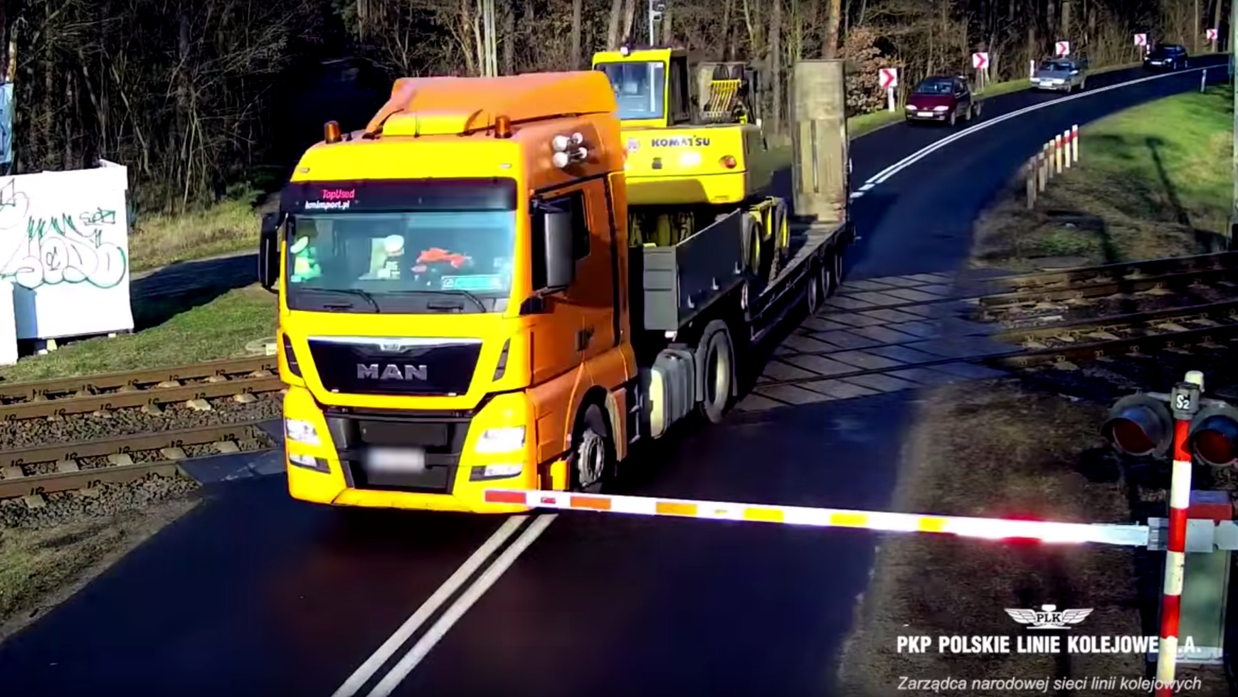 Zespół pojazdów z ładunkiem wyłamał rogatkę niczym zapałkę i niemal przejechał przez tory. Niestety, ostatecznie to się nie udało. Szczęście w nieszczęściu, że lokomotywa uderzyła w tył naczepy, nie w koparkę, i pociąg nie wykoleił się.
