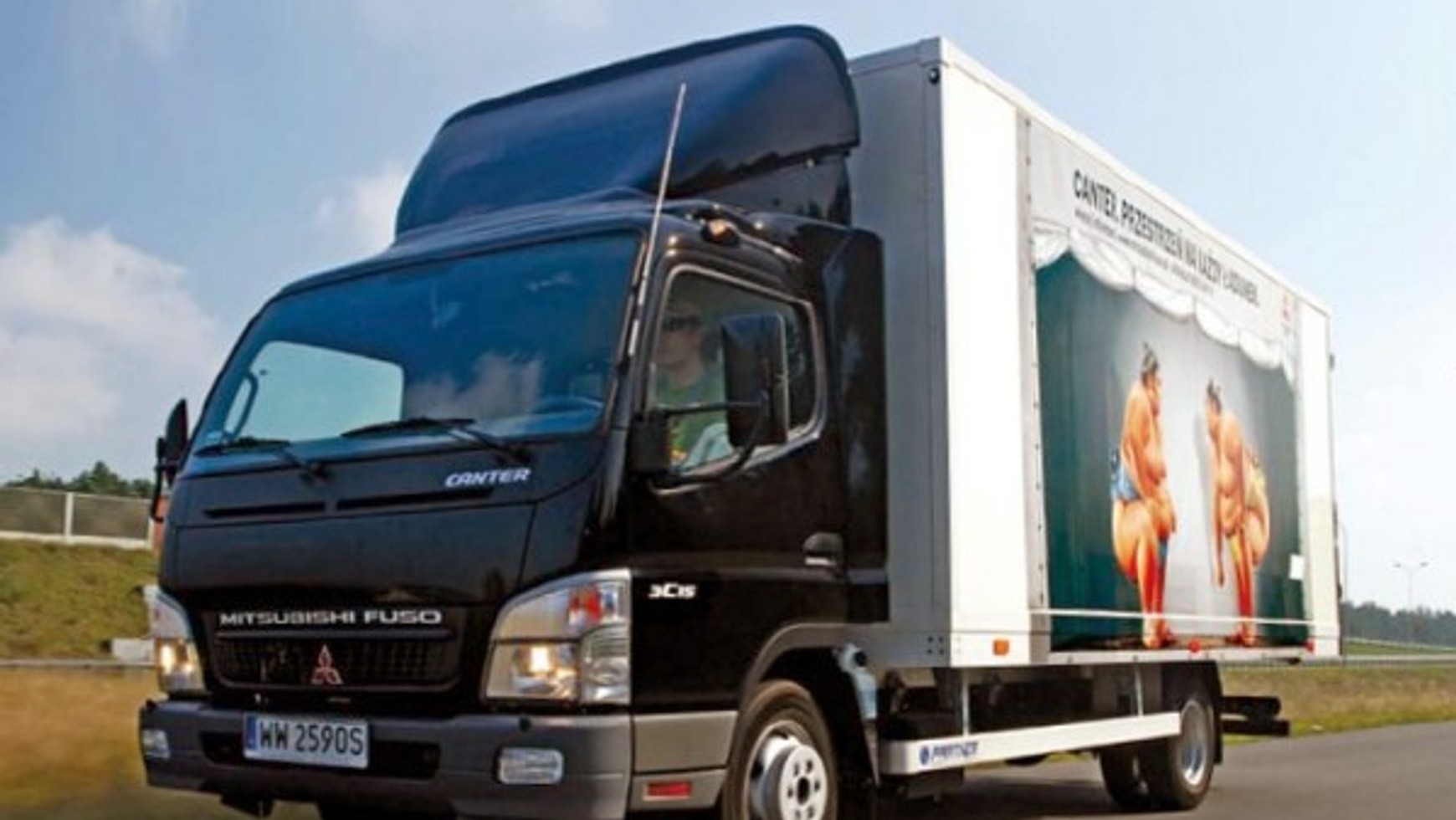 W przypadku samochodów ciężarowych dużo bardziej istotna niż wygląd jest funkcjonalność i niski koszt eksploatacji. Canterowi trudno jednak odmówić estetyki: duże przednie reflektory z halogenami, panoramiczna, niemal pionowa szyba i duże drzwi boczne. Znacznym udogodnieniem dla Europejczyków jest wyższa niż w innych ciężarówkach japońskich kabina i szerzej otwierające się drzwi. Aby obniżyć opory powietrza, w Fuso zastosowano owiewkę. Sama zabudowa izotermiczna jest bardzo efektowna, a to za sprawą grafiki, która przedstawia dwóch zawodników sumo. Odrobina inwencji, a jaki efekt.