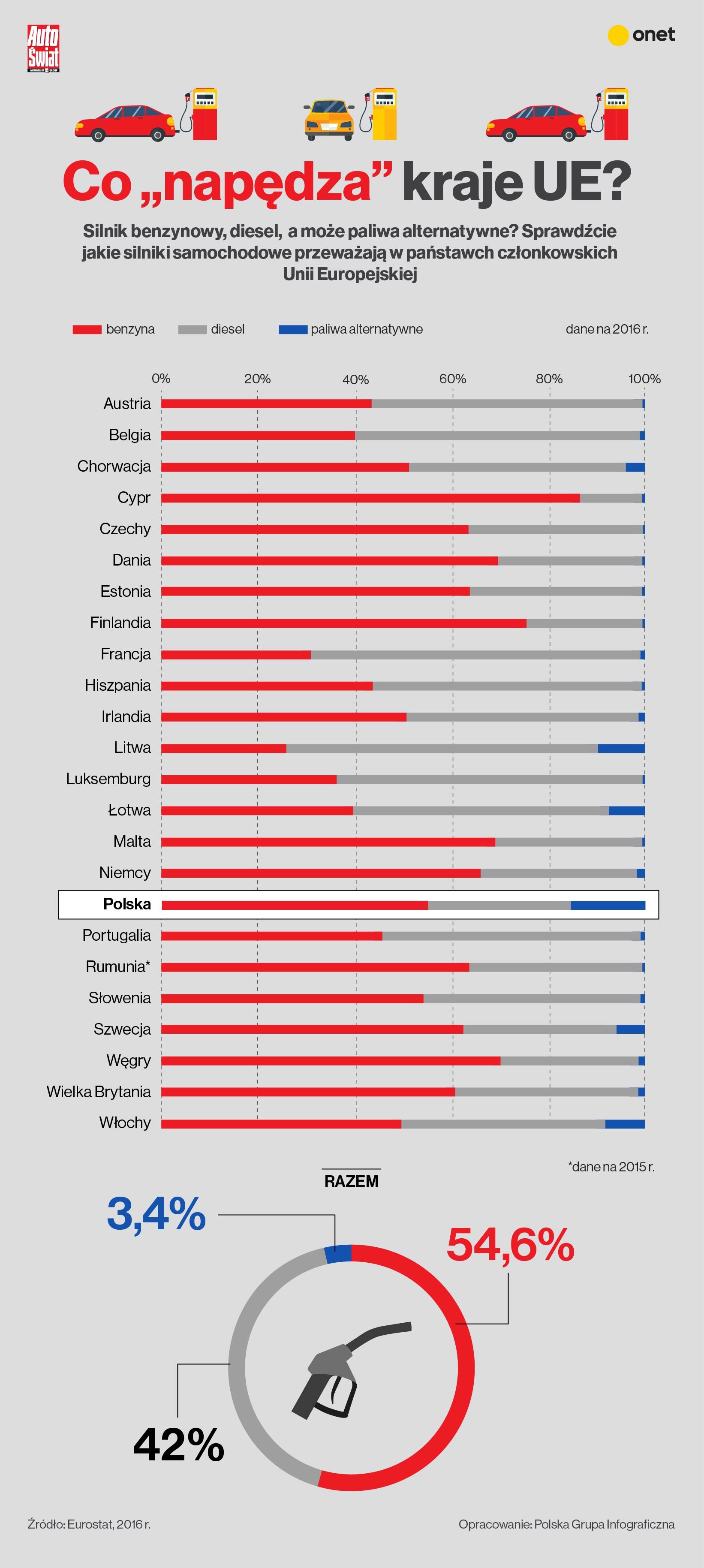 Co "napędza" kraje UE? [Infografika] 30 stycznia 2019, 08:35 Ponad połowa samochodów w krajach Unii Europejskiej w 2016 roku jeździła na benzynę - wynika z opublikowanych w styczniu danych Eurostatu. Na drugim miejscu znalazły się diesle.