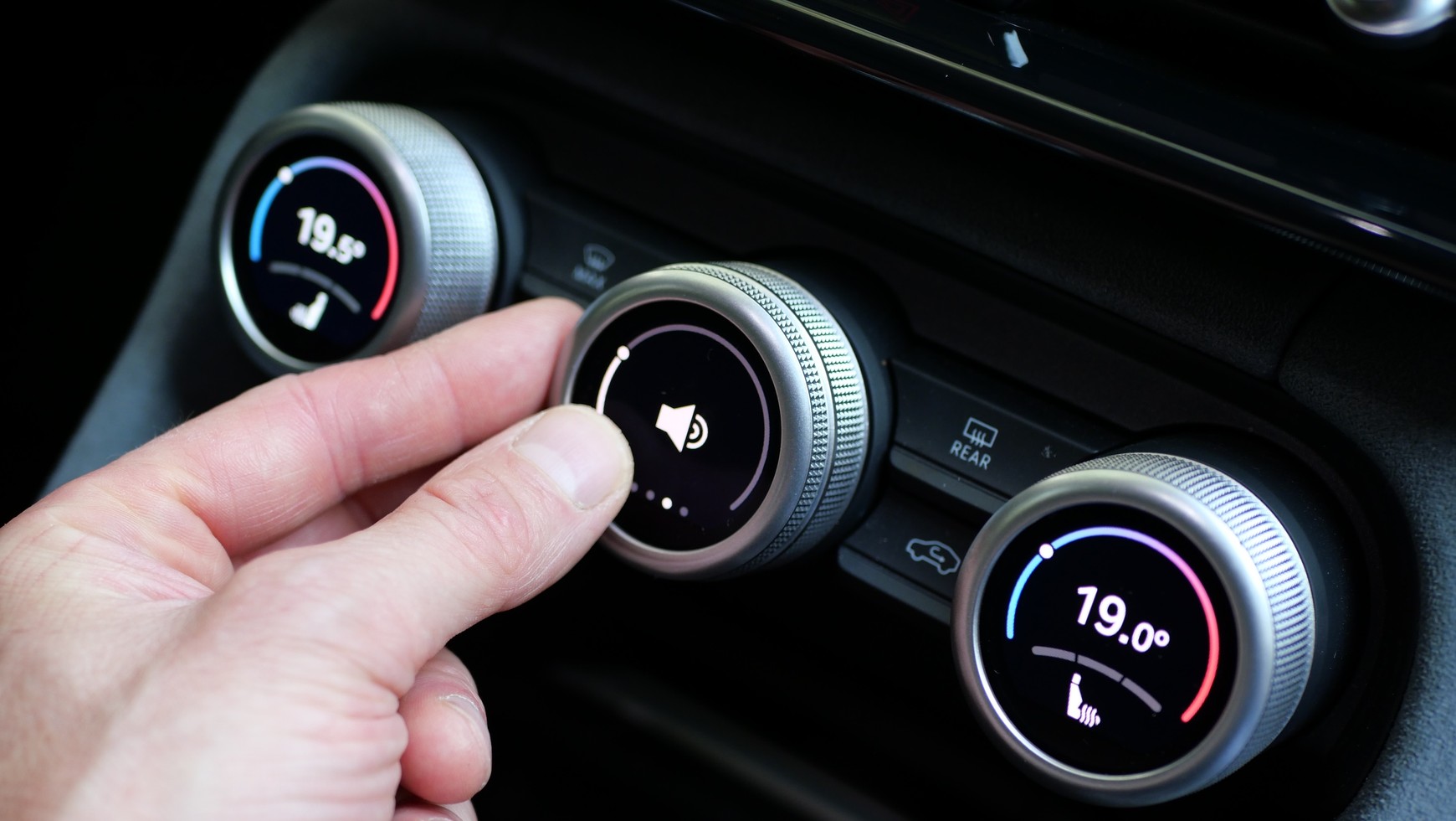 Pomiędzy pokrętłami znajdują się cztery dodatkowe przyciski, które kontrolują opcje takie jak: ogrzewanie przedniej szyby i tylnej szyby, automatyczna klimatyzacja czy wewnętrzna cyrkulacja powietrza. Europa lubi to.