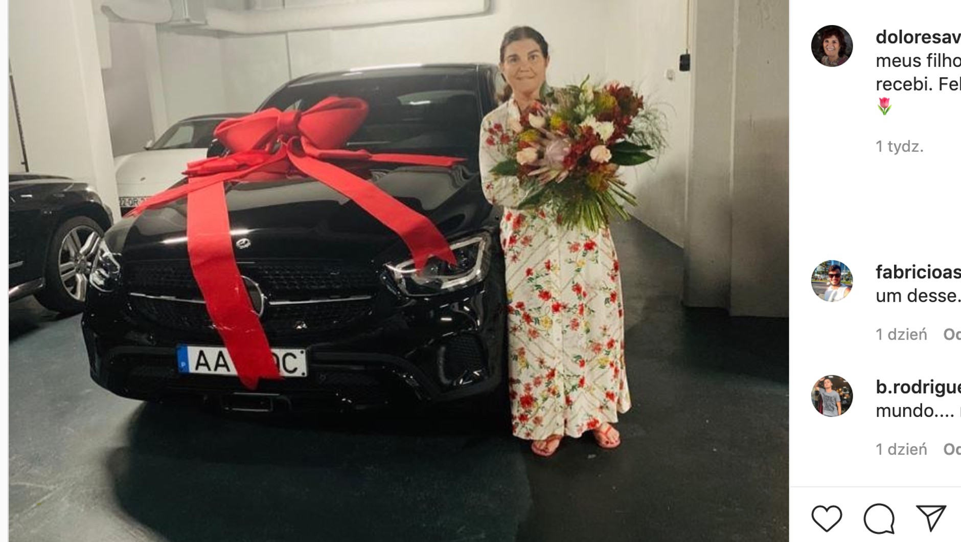 Na instagramowym profilu pani Marii Dolores dos Santos Aveiro pojawiło się zdjęcie, na którym pozuje w garażu podziemnym z przewiązanym czerwoną kokardą Mercedesem GLC Coupé. Do tego promienny uśmiech na twarzy 65-letniej mamy Cristiano Ronaldo, wielki bukiet kwiatów i komentarz: „Dziękuję moim dzieciom za prezenty, które dziś dostałam. Pięknego Dnia Matki dla wszystkich mam!”