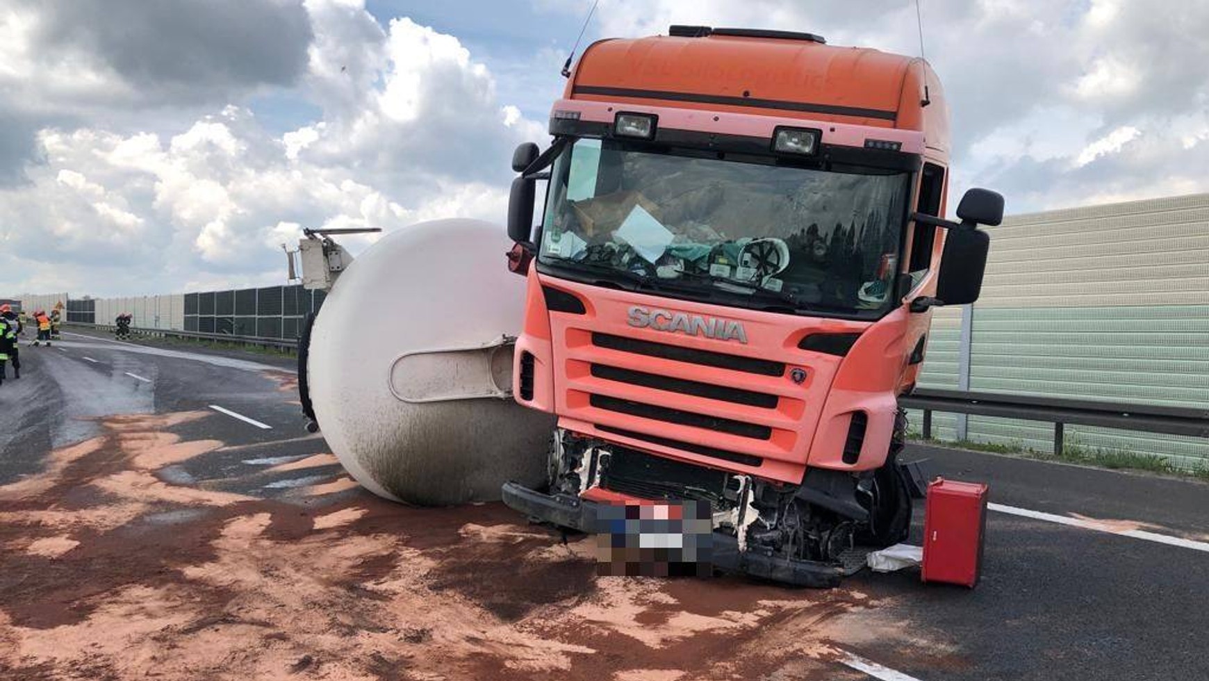 Utrudnienia w ruchu na A4 w kierunku Krakowa mogą potrwać kilka godzin, bo do podniesienia przewróconej cysterny potrzebny jest ciężki sprzęt. (PAP)